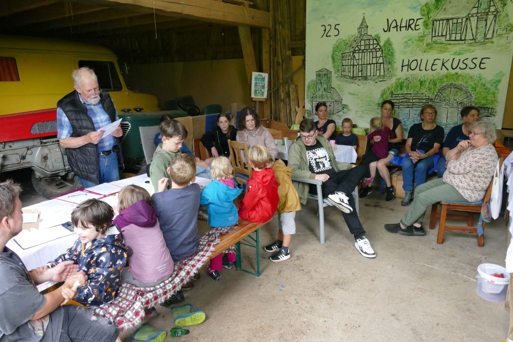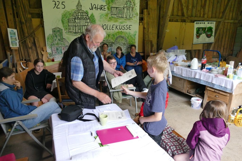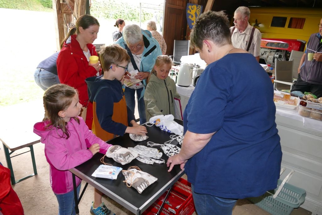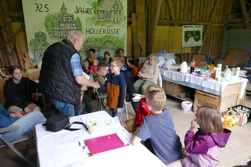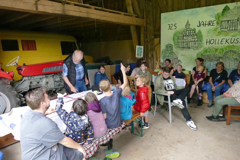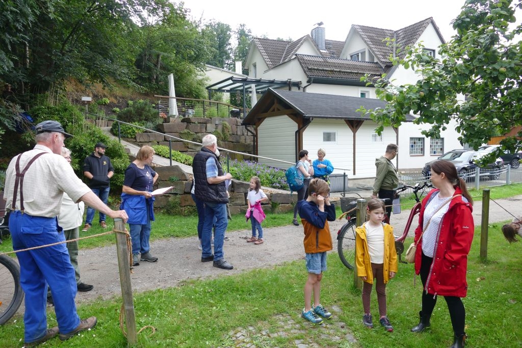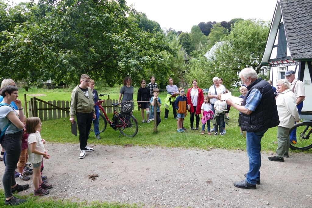 Der diesjährigen „Aktion für Kinder“ in Form einer „Dorferkundung“ war ein sehr schöner Erfolg beschieden. Zwar erwies sich der Termin in den Sommerferien nicht grade als günstig – etliche Kinder waren im Urlaub - gleichwohl kamen schließlich doch 17 Anmeldungen zusammen und auch das Wetter „spielte mit“: Zumindest beim Start am Backes war es noch trocken. In vier Gruppen erkundeten die Kinder in Begleitung ihrer Eltern oder Großeltern das Dorf, als „Leitschnur“ diente dabei ein Fragenkatalog, der die Gruppen auf verschiedenen Wegen zu einzelnen Stationen führte, zum Wasserrad, zum neuen Glockenturm, zum Bienenhotel am „Dudenberg“, zur Schmiede und zu vielen anderen interessanten Orten.