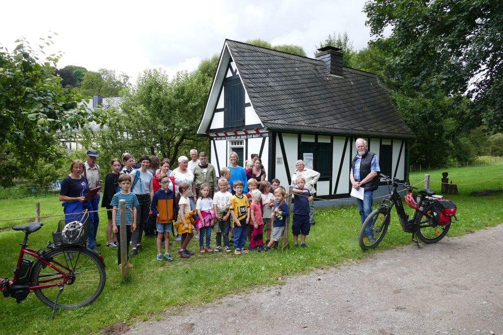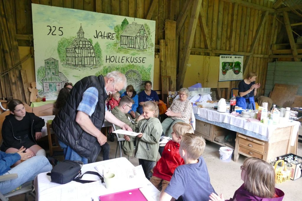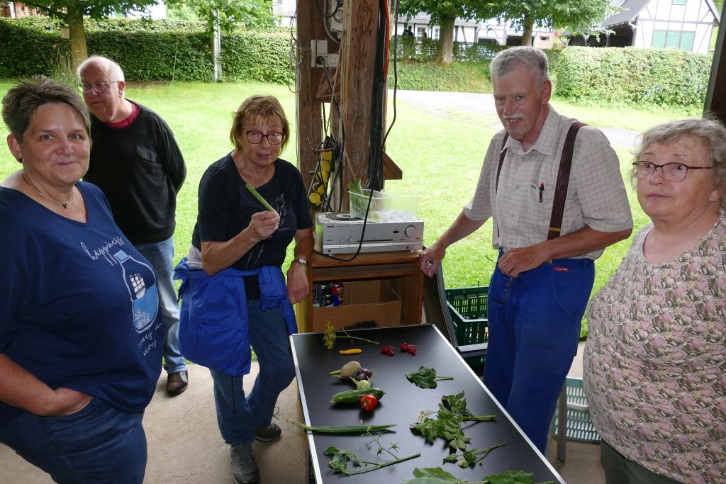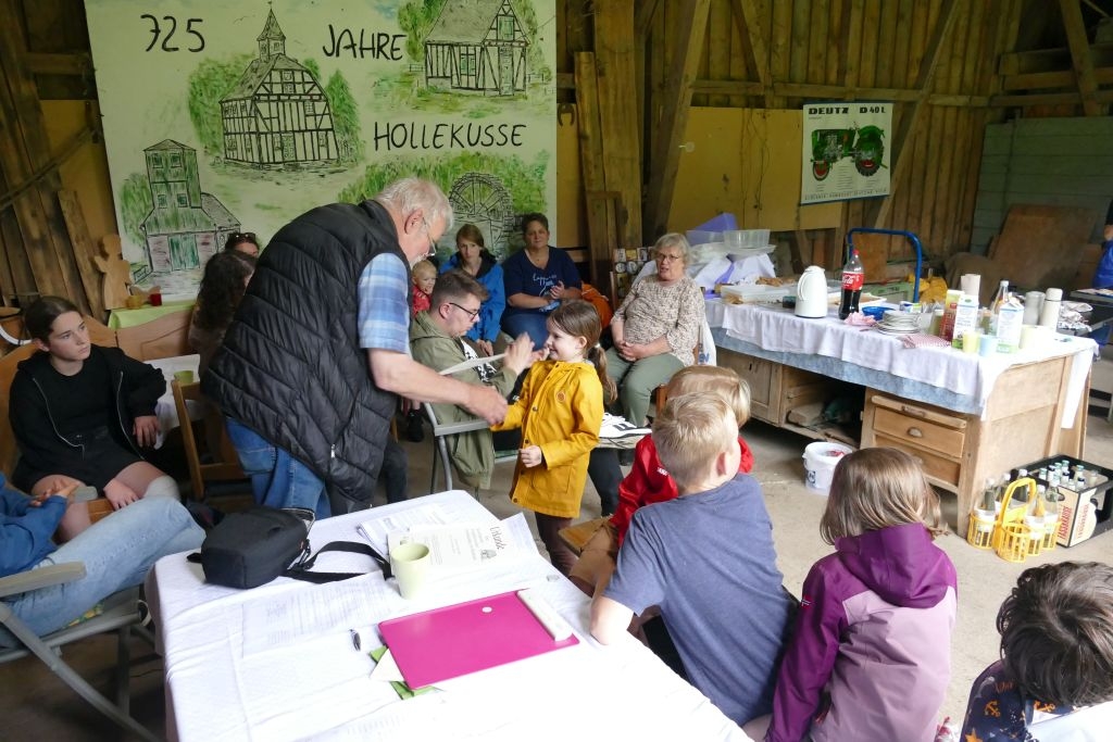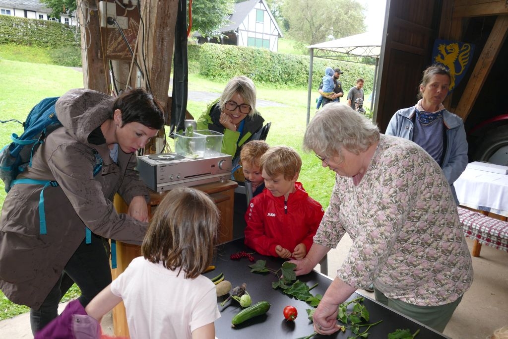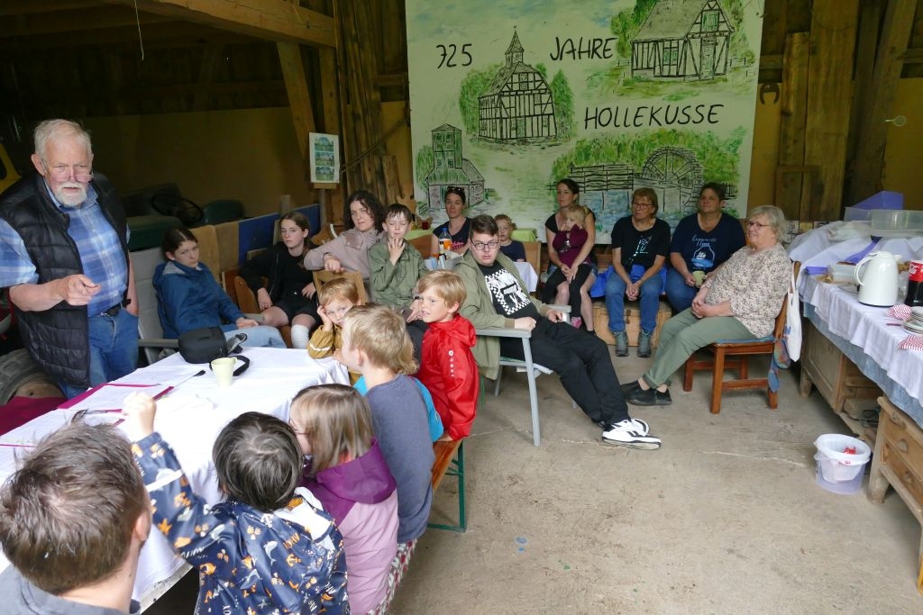 Der diesjährigen „Aktion für Kinder“ in Form einer „Dorferkundung“ war ein sehr schöner Erfolg beschieden. Zwar erwies sich der Termin in den Sommerferien nicht grade als günstig – etliche Kinder waren im Urlaub - gleichwohl kamen schließlich doch 17 Anmeldungen zusammen und auch das Wetter „spielte mit“: Zumindest beim Start am Backes war es noch trocken. In vier Gruppen erkundeten die Kinder in Begleitung ihrer Eltern oder Großeltern das Dorf, als „Leitschnur“ diente dabei ein Fragenkatalog, der die Gruppen auf verschiedenen Wegen zu einzelnen Stationen führte, zum Wasserrad, zum neuen Glockenturm, zum Bienenhotel am „Dudenberg“, zur Schmiede und zu vielen anderen interessanten Orten.