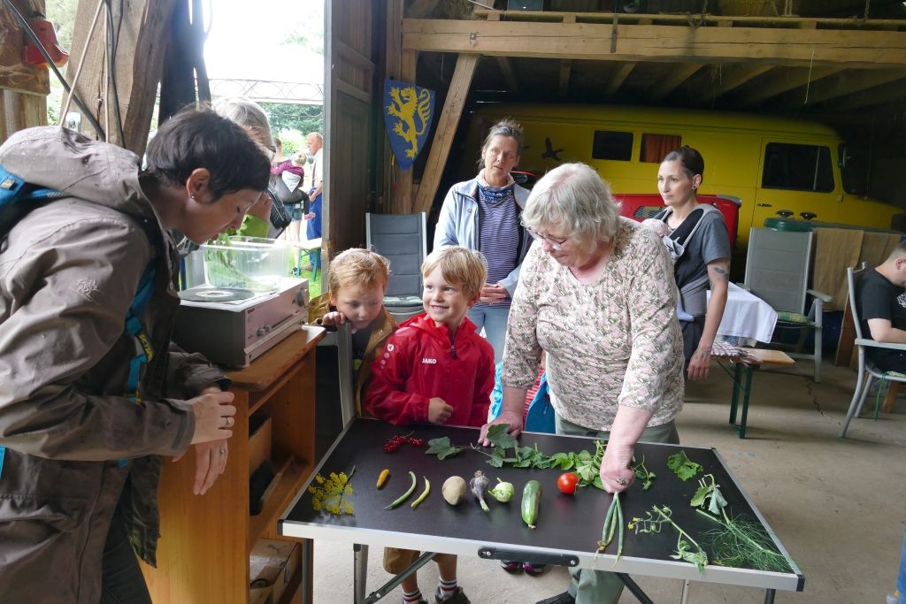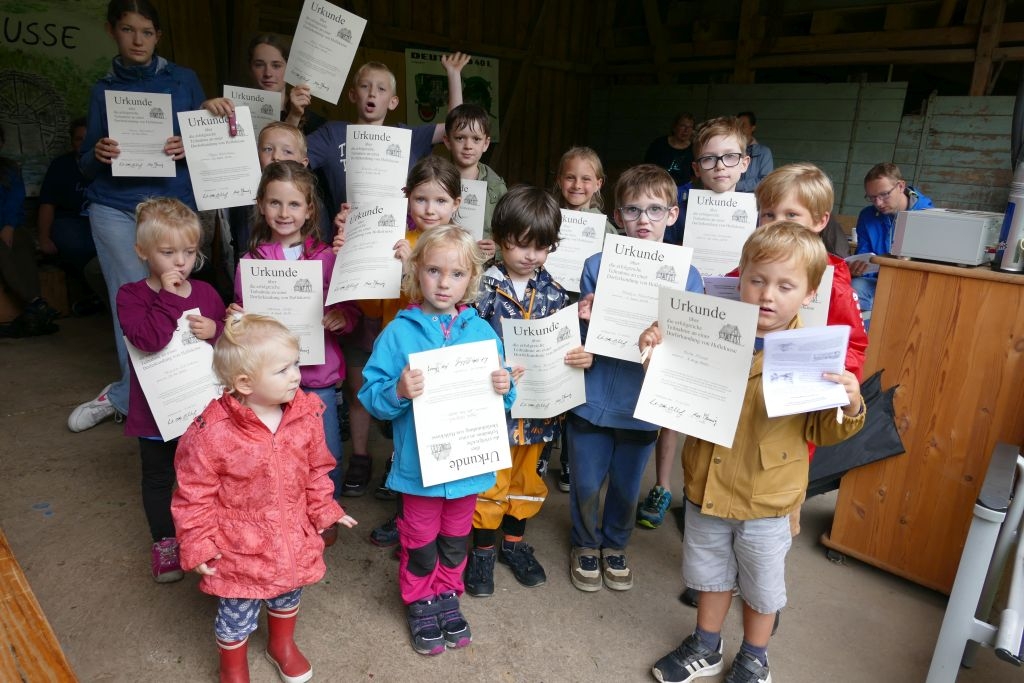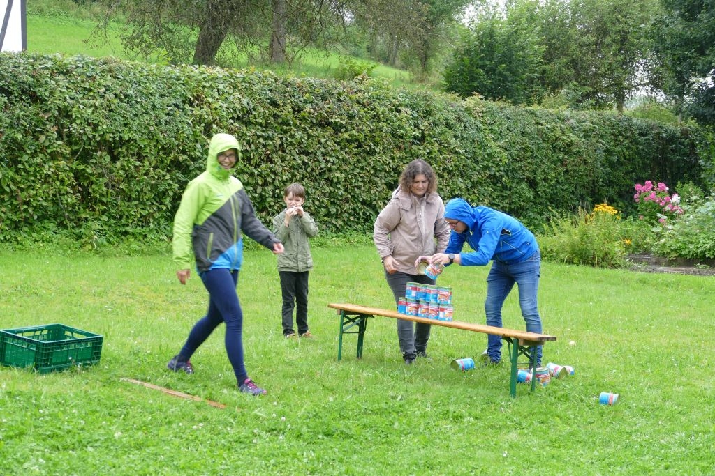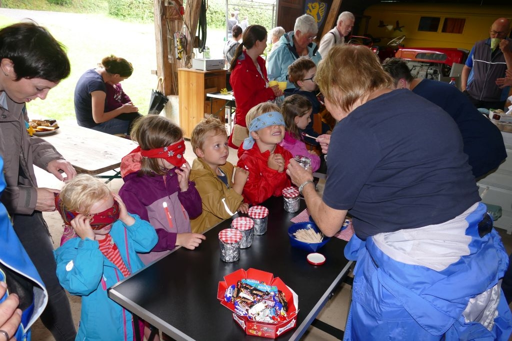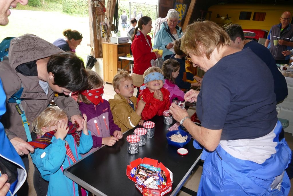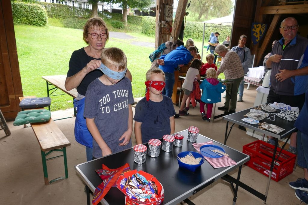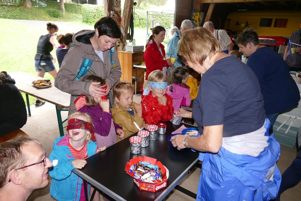 Aus den am jeweiligen Objekt zu beantwortenden Fragen erwuchs viel Wissenswertes für Alt und Jung. Am gemeinsamen Zielpunkt der Erkundung – in „Gisselersch“ Scheune - erwartete die Teilnehmer eine Reihe interessanter Aufgaben: Da waren verschiedene Gegenstände zu ertasten, Blätter und Äste den jeweiligen Baumarten zuzuordnen, Pflanzen und Früchte des Gartens zu bestimmen und auch der „Geschmacksinn“ der Kinder war anhand verschiedener, ihnen präsentierter „Kostproben“ gefordert. Beim Dosenwerfen und dem Jengaspiel war dagegen viel Geschick gefragt. Zwar hatte mittlerweile etwas Regen eingesetzt, aber dank „Gisselersch“ Scheune konnten das Lösen der Aufgaben und die Spiele größtenteils „unter Dach“ stattfinden, ebenso wie das gemeinsame Kaffeetrinken und die Ausgabe der wohlverdienten Urkunden an die Kinder. Zum Kaffeetrinken waren immerhin 38 Personen zugegen - Kinder, Helfer und Begleitpersonen. Die aufwendigen Vorbereitungen zu der Veranstaltung hatten sich gelohnt, den Kinder gefiel die Aktion ebenso wie den Erwachsenen. Auch das Wissen der Jungen und Mädchen um die Natur war überaus lobenswert!