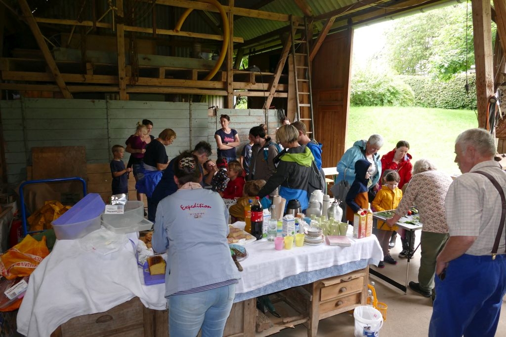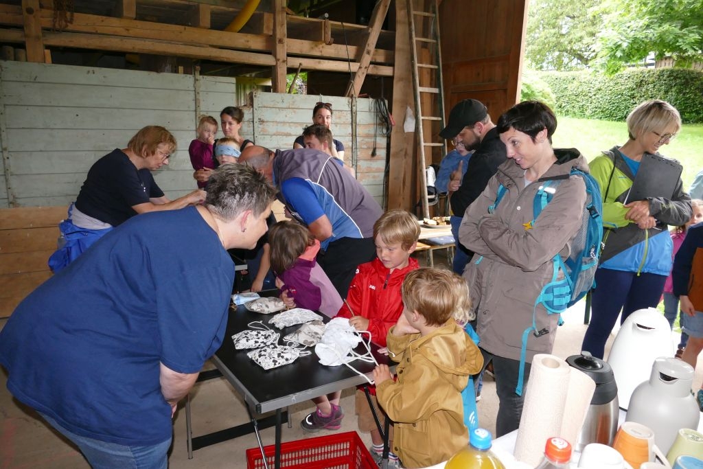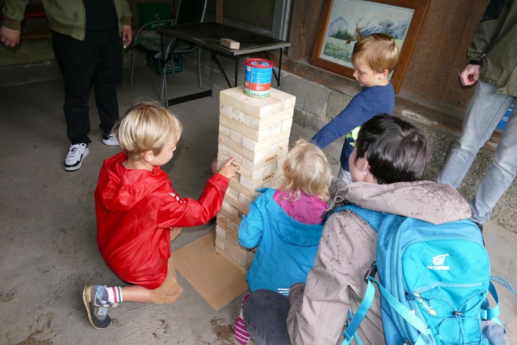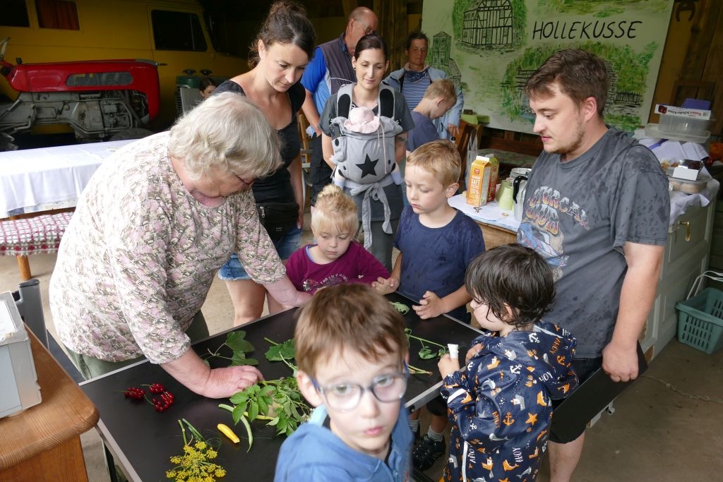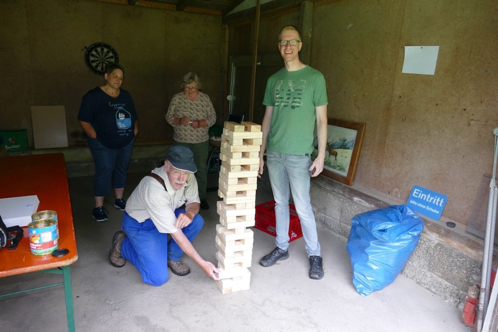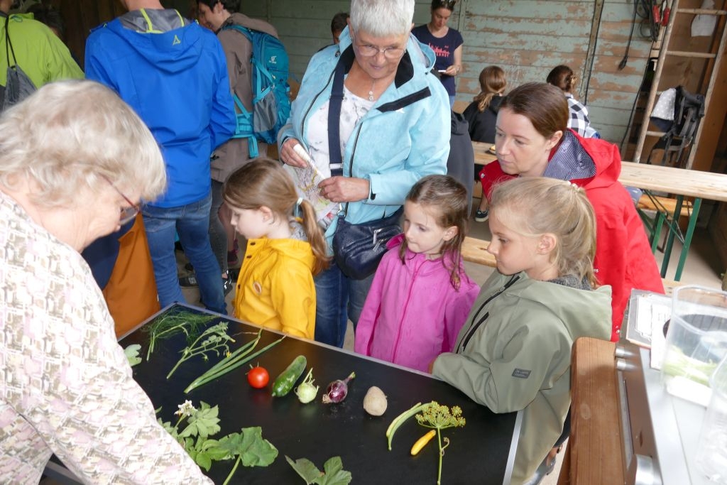 Aus den am jeweiligen Objekt zu beantwortenden Fragen erwuchs viel Wissenswertes für Alt und Jung. Am gemeinsamen Zielpunkt der Erkundung – in „Gisselersch“ Scheune - erwartete die Teilnehmer eine Reihe interessanter Aufgaben: Da waren verschiedene Gegenstände zu ertasten, Blätter und Äste den jeweiligen Baumarten zuzuordnen, Pflanzen und Früchte des Gartens zu bestimmen und auch der „Geschmacksinn“ der Kinder war anhand verschiedener, ihnen präsentierter „Kostproben“ gefordert. Beim Dosenwerfen und dem Jengaspiel war dagegen viel Geschick gefragt. Zwar hatte mittlerweile etwas Regen eingesetzt, aber dank „Gisselersch“ Scheune konnten das Lösen der Aufgaben und die Spiele größtenteils „unter Dach“ stattfinden, ebenso wie das gemeinsame Kaffeetrinken und die Ausgabe der wohlverdienten Urkunden an die Kinder. Zum Kaffeetrinken waren immerhin 38 Personen zugegen - Kinder, Helfer und Begleitpersonen. Die aufwendigen Vorbereitungen zu der Veranstaltung hatten sich gelohnt, den Kinder gefiel die Aktion ebenso wie den Erwachsenen. Auch das Wissen der Jungen und Mädchen um die Natur war überaus lobenswert!