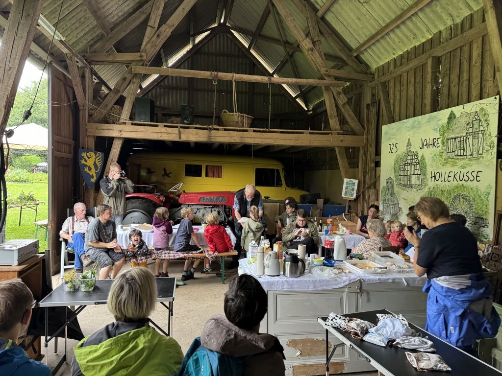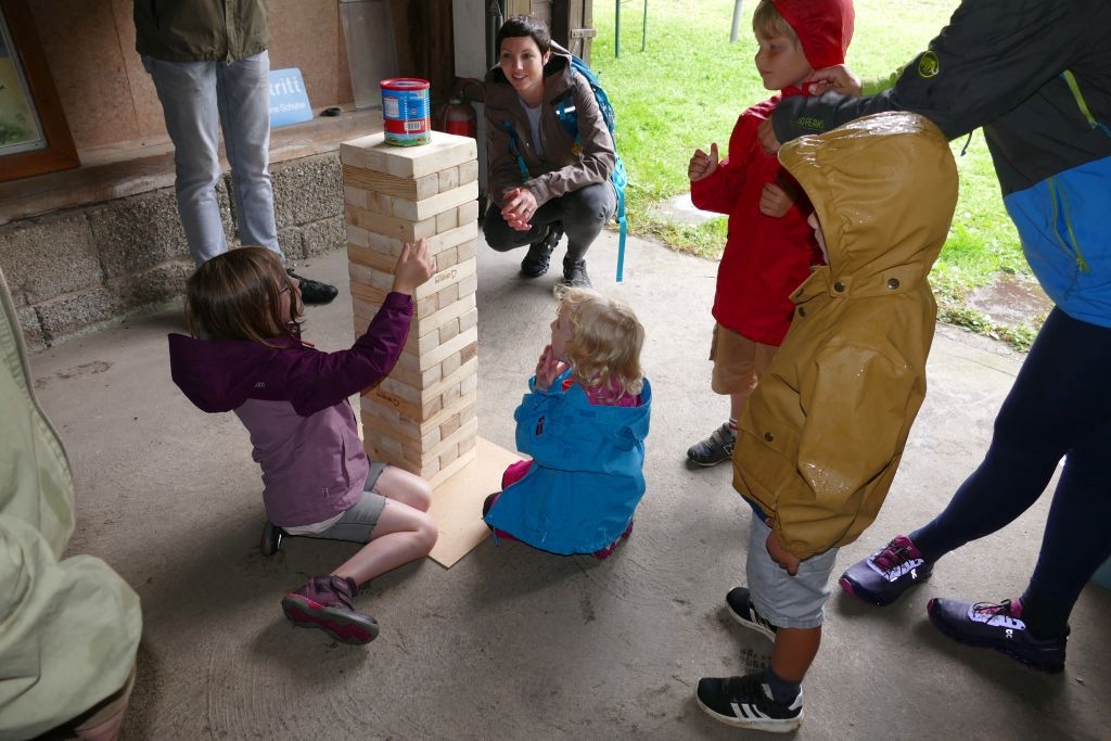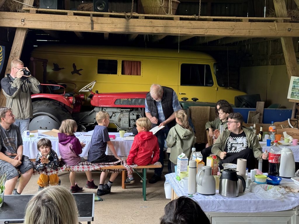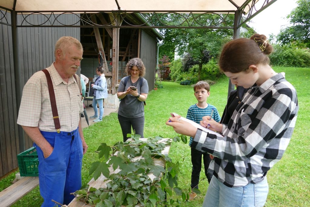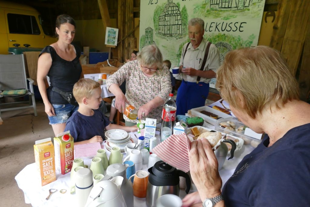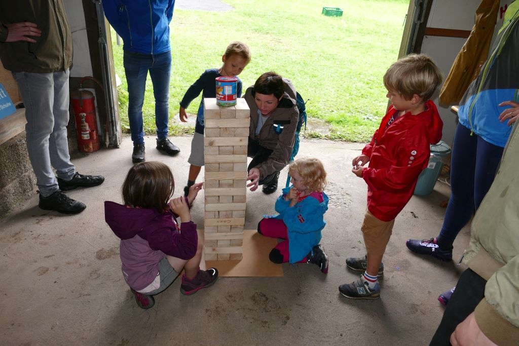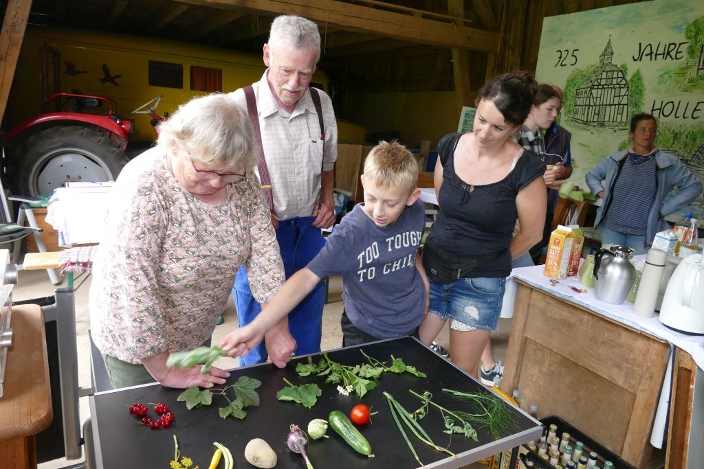 Aus den am jeweiligen Objekt zu beantwortenden Fragen erwuchs viel Wissenswertes für Alt und Jung. Am gemeinsamen Zielpunkt der Erkundung – in „Gisselersch“ Scheune - erwartete die Teilnehmer eine Reihe interessanter Aufgaben: Da waren verschiedene Gegenstände zu ertasten, Blätter und Äste den jeweiligen Baumarten zuzuordnen, Pflanzen und Früchte des Gartens zu bestimmen und auch der „Geschmacksinn“ der Kinder war anhand verschiedener, ihnen präsentierter „Kostproben“ gefordert. Beim Dosenwerfen und dem Jengaspiel war dagegen viel Geschick gefragt. Zwar hatte mittlerweile etwas Regen eingesetzt, aber dank „Gisselersch“ Scheune konnten das Lösen der Aufgaben und die Spiele größtenteils „unter Dach“ stattfinden, ebenso wie das gemeinsame Kaffeetrinken und die Ausgabe der wohlverdienten Urkunden an die Kinder. Zum Kaffeetrinken waren immerhin 38 Personen zugegen - Kinder, Helfer und Begleitpersonen. Die aufwendigen Vorbereitungen zu der Veranstaltung hatten sich gelohnt, den Kinder gefiel die Aktion ebenso wie den Erwachsenen. Auch das Wissen der Jungen und Mädchen um die Natur war überaus lobenswert!
