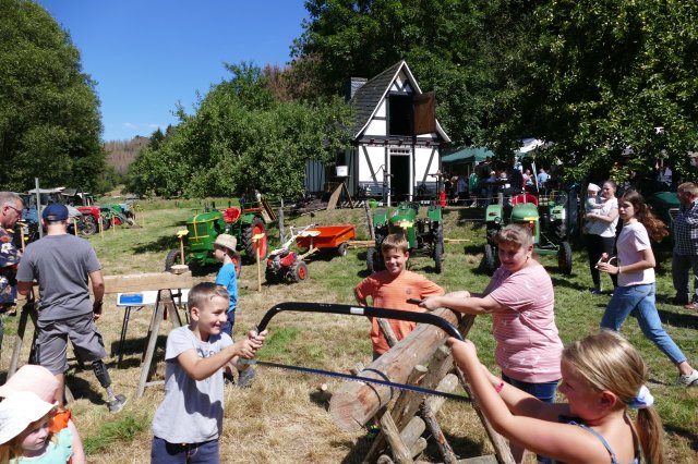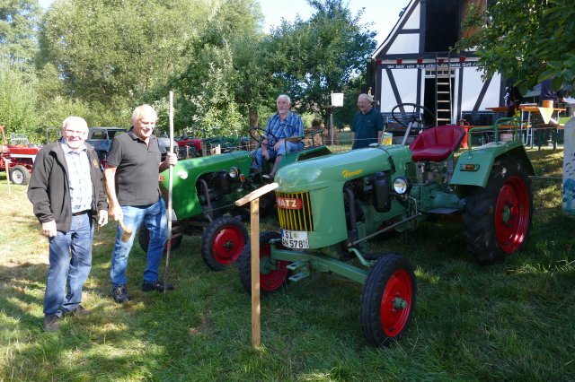 Aber auch für die Erwachsenen war mit kulinarischen und technischen Leckerbissen bestens gesorgt. Bei den Speisen konnte zwischen selbstgekochter Erbsensuppe, herzhaften Grillgerichten und selbstgebackenem Kuchen gewählt werden, im Backes ließen sich die Gäste beim Backen von Brot und Kuchen die Funktion des Steinofens erklären und an den Tischen war Zeit und Gelegenheit für ausführliche Gespräche. Dem Anspruch, neben der Förderung sozialer Kontakte den Festbesuchern stets auch heimatkundliche oderhistorische Informationen anzubieten und so zum Gedankenaustausch anzuregen, wurde das Fest einmal mehr gerecht: Unter dem Motto Kräftig und unverwüstlich waren schon am frühen Morgen im Wiesengrund vor dem idyllisch gelegenen Backhaus 17 historische Schlepper und Zugmaschinen aufgefahren, vom 15 PS Deutz aus dem Jahre 1952 über Unimogs aus den aus den frühen 1960ern bis zum Einachsschlepper mit Triebachsanhänger. Einige der Oldtimer präsentierten sich vorbildlich restauriert, andere von den Spuren des jahrzehntelangen Gebrauchs gezeichnet, etliche davon sind nach wie vor im Einsatz. Ein Quiz mit Fragen zur Motorisierung der örtlichen Landwirtschaft und zu den ausgestellten Zugmaschinen wartete mit interessanten Informationen auf. So war zu erfahren, dass allein in Langenholdinghausen derzeit mehr als 45 Traktoren und Zugmaschinen stehen, die alle zusammen gerechnet - eine Gesamtleistung von über 2400 PS aufweisen. Die Beschäftigung an und mit den Traktoren wird dabei von etlichen der Besitzer als Steckenpferd betrachtet. Die heute mit Hilfe der Traktoren verrichtete Arbeit wurde 1950 noch von 50 Tiergespannen, aber einer umso größeren Zahl von Arbeitskräften vollbracht. Informationstafeln zu den vielfältigen Aktivitäten des Arbeitskreises Dorferneuerung in der jüngeren Zeit rundeten das Rahmenprogramm der Veranstaltung ab.