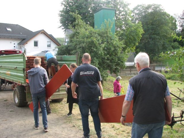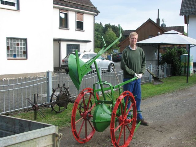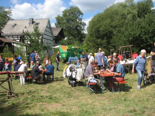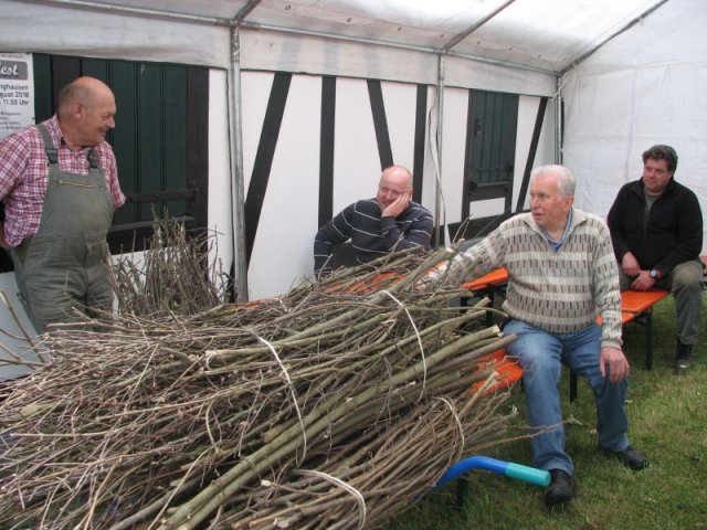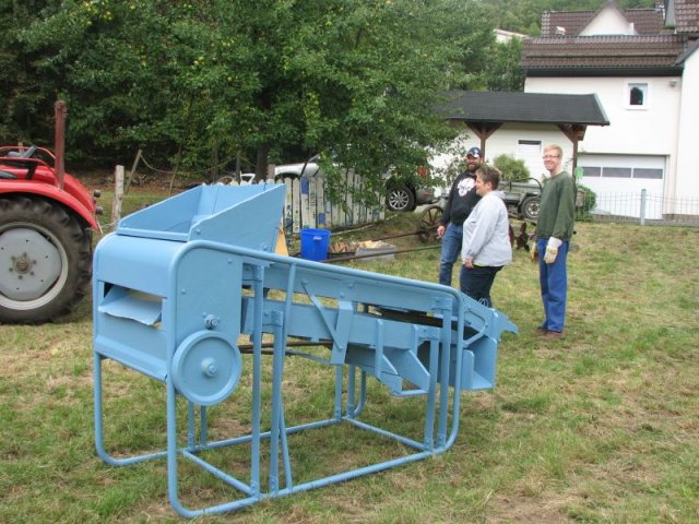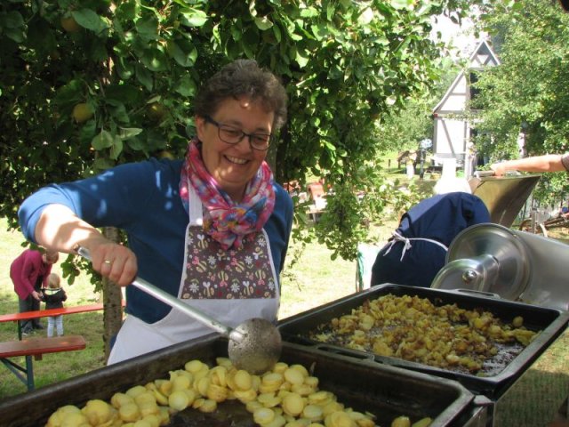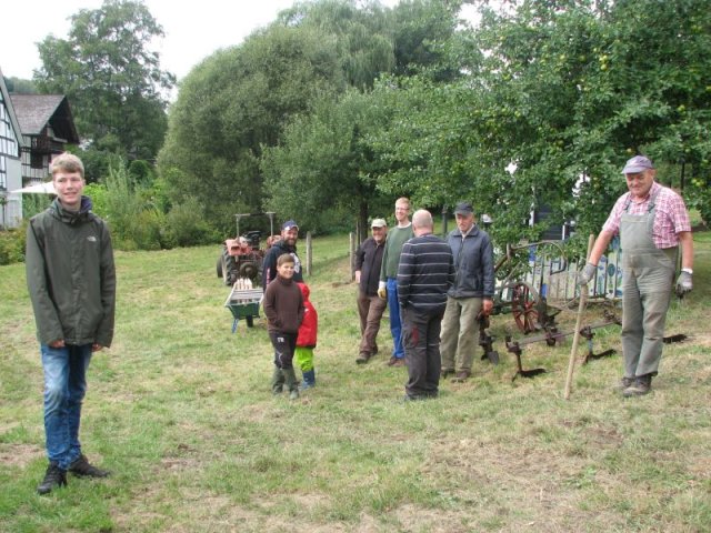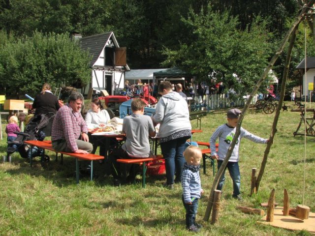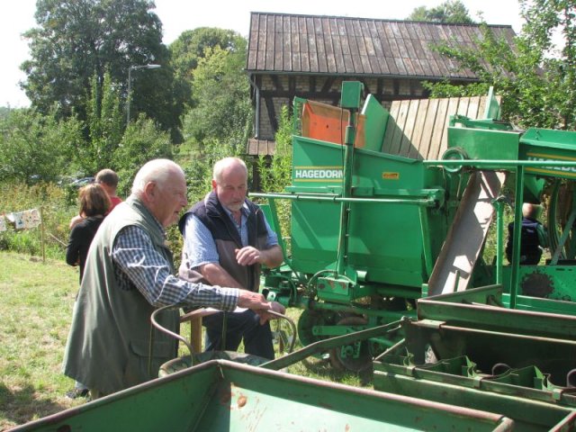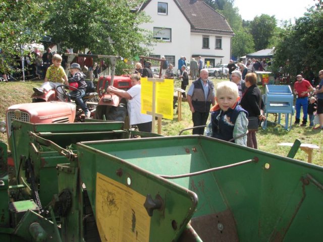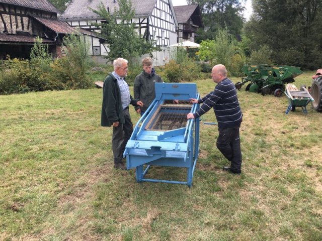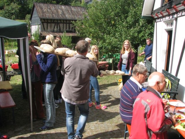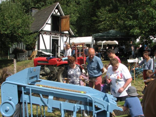 In diesem Jahr stand das Fest ganz „im Zeichen der Kartoffel“: Zum Spießbraten wurden würzige Bratkartoffeln gereicht und zu den zahlreichen Erzeugnissen aus dem Steinofen gesellte sich erstmals der „Bäckel“ – ein Weißbrot mit Kartoffelanteil. Am Basteltisch inmitten zahlreicher traditioneller Spielgebote für die jüngeren Gäste übten sich Mädchen und Jungen im Kartoffeldruck – mit Hilfe der „tollen Knolle“ wurden Tragetaschen aus Jute mit ansprechenden Motiven individuell gestaltet. „250 Jahre Kartoffelanbau in Langenholdinghausen“ präsentierte der Arbeitskreis eine vollständige Sammlung nahezu aller im Kartoffelanbau einst und jetzt im Dorf eingesetzten Werkzeuge und Geräte. Gut 30 Exponate zum Pflanzen und Pflegen, zum Ernten und Sortieren der Kartoffeln waren in chronologischer Reihenfolge aufgebaut und hinsichtlich ihrer Aufgabe und Funktion in Wort und Bild beschrieben – von der Rodehacke, „Karschd“ genannt, über den Pflug oder das „Vielfachgerät Landpfleger“ aus den 1960er Jahren bis hin zum Kartoffelvollernter vom Typ „Wisent“. Alle Ausstellungsstücke sind einsatzfähig und zum Teil auch heute noch in Gebrauch. Wer am Quiz zur Ausstellung teilnahm, sah sich umso mehr veranlasst, die Ausführungen der Informationentafeln genauer zu studieren. Als Hauptgewinn winkte auch hier – wie könnte es anders sein – ein Sack schmackhafter Kartoffeln. Bei vielen älteren Festbesuchern weckten insbesondere die pferdegezogenen Kartoffelroder Erinnerungen an die Mithilfe beim herbstlichen Kartoffelaufsammeln in jungen Jahren, die kleineren Gäste drehten dagegen mit anhaltender Begeisterung die Kurbel der Kartoffelsortiermaschine oder fühlten sich auf den Sitzen der Pflanzmaschinen und Traktoren sichtlich wohl. Das sonnige Wetter war der sehr hohen Zahl von Besuchern bestimmt förderlich, es begünstige ebenso die wohl einzigartige Atmosphäre rund um das Backhaus am „Zinnwald“. Interessante Gespräche an den Ständen und Tischen und die zufriedene Mienen der Gäste zeigten den 50 aktiven Helfern, dass sich ihre Arbeit zur Vorbereitung und Durchführung des Festes gelohnt hatten.