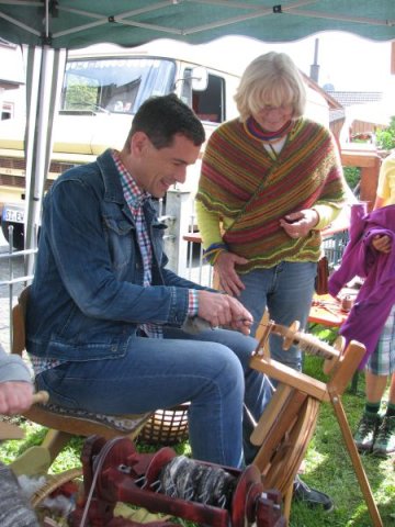 Am Weg zum Backhaus empfing die Besucher eine interessante Präsentation historischer Gerätschaften zum Thema „Spinnen, Weben Nähen – die Herstellung von Tuch und Kleidung in früherer Zeit“. Alle ausgestellten Exponate waren von örtlichen Haushalten zur Verfügung gestellt worden – vom Flachshechel über Spinnräder und den Teilen eines alten Webstuhles bis hin zu einer Vielzahl von Kleidungsstücken aus noch selbstgewebten Stoffen, darunter ein „Herrenhochzeitshemd“ von 1867. Viel Beachtung fanden die Vorführungen der Arbeit am Spinnrad, eine Kunst, in der sich der eine oder andere Festbesucher selbst üben konnte. Auch bei den Spielen und Beschäftigungen für die noch jüngeren Gäste bildete der Umgang mit Wolle und Faden einen Schwerpunkt. Ein Quiz zum Thema „Tuch und Kleidung“, Informationstafeln zu den aktuellen Aktivitäten des Arbeitskreises und die Möglichkeit zum Kauf von Kartoffeln und Eiern rundeten das Rahmenprogramm des Festes ab. „Ausverkauft“ hieß es am Nachmittag bei den Helfern vom Arbeitskreis Dorferneuerung und Dorfgeschichte. Der selbstgebackene Kuchen und die Backesbrote hatten allesamt zufriedene Abnehmer gefunden.