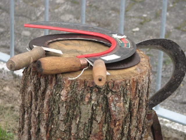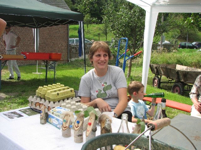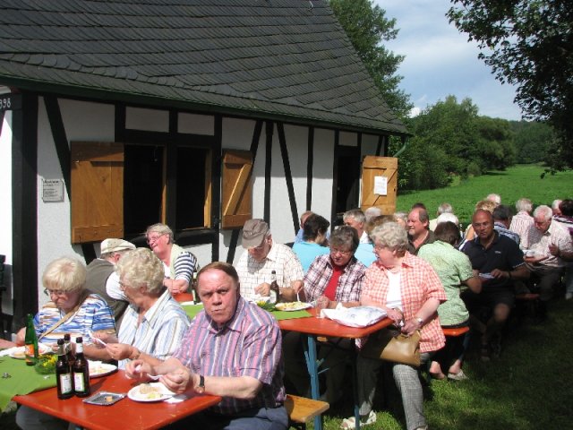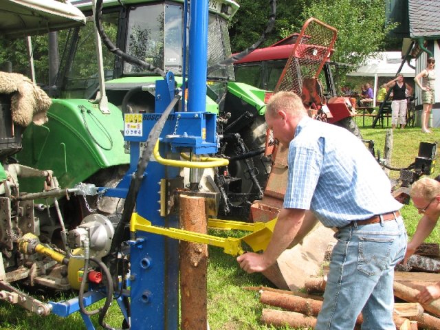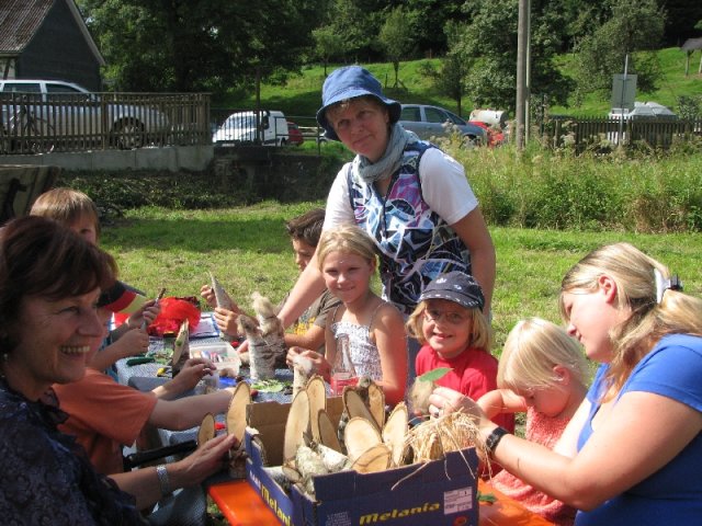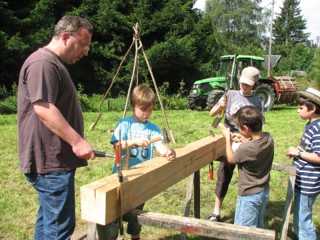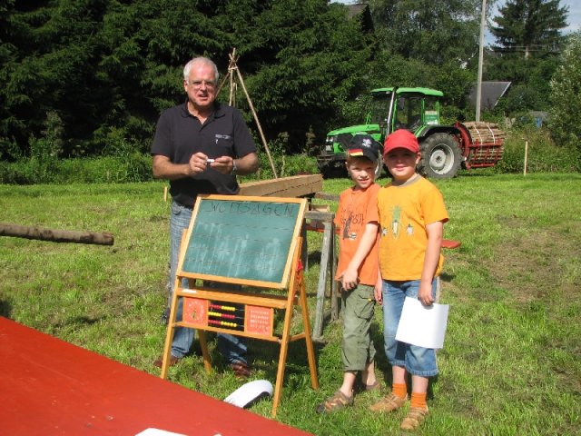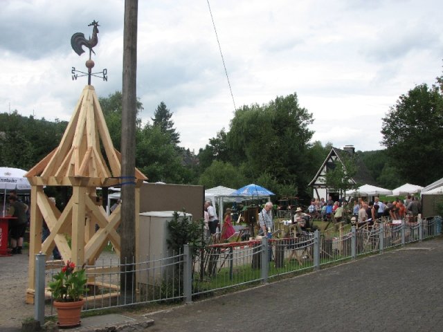 Auch diesmal bereicherten wieder Angebote für groß und klein das schon traditionelle Fest: Unter der Überschrift „Arbeiten im Hauberg – damals und heute …“ präsentierte der Arbeitskreis traditionelle und moderne Gerätschaften der Waldwirtschaft, vom „Knipp“ über die „Lohwaage“ bis hin zum hydraulisch betätigten Holzspalter am Forstschlepper. Bei einem Ratespiel konnten die Gäste ihre Kenntnisse über die Bäume im heimischen Wald unter Beweis stellen: Insgesamt zwölf Abschnitten von Baumstämmen war der jeweils richtige Name des Baumes zuzuordnen. In der Wiese übten sich Eltern und Kinder beim Holzsägen von Hand am Sägebock oder beim „treffsicheren“ Einschlagen von Nägeln in einen Balken. Am Basteltisch entstanden unter geschickten Kinderhänden aus Birkenholz, Blättern und Wolle wundervolle „Waldmännchen“ und am Stand mit Erzeugnissen der heimischen Landwirtschaft herrschte eine rege Nachfrage nach Eiern, Kartoffeln und Honig. Im Backes wurde interessierten Gästen der Steinofen erklärt und an den Tischen war Zeit und Gelegenheit für gute Gespräche – entspannte Mienen wohin man auch schaute. Während all dem bot sich den Festbesuchern noch ein besonderer Blickfang: In vielen Arbeitsstunden hatten die „Zimmerleute“ des Arbeitskreises den einstigen Glockenturm rekonstruiert, der bis zu Beginn der 1950er Jahre das Dach der örtlichen Kappellenschule zierte. Während des NRW-Tages im September in Siegen wird der kleine Turm mit einer Glocke und originalem Wetterhahn am Stand des Arbeitskreises zu sehen sein.
