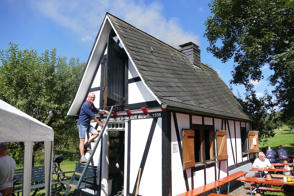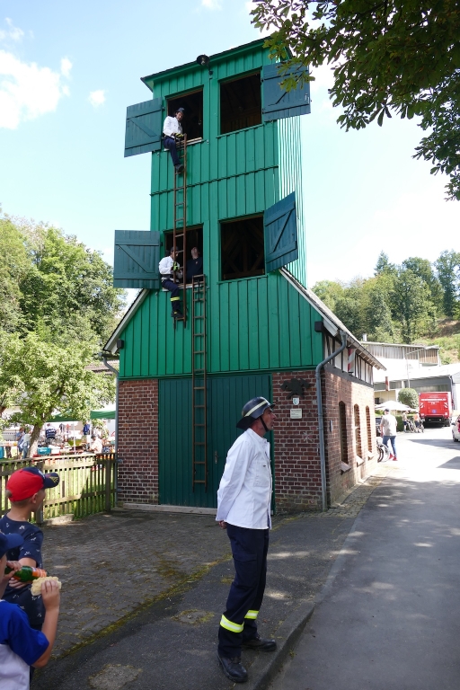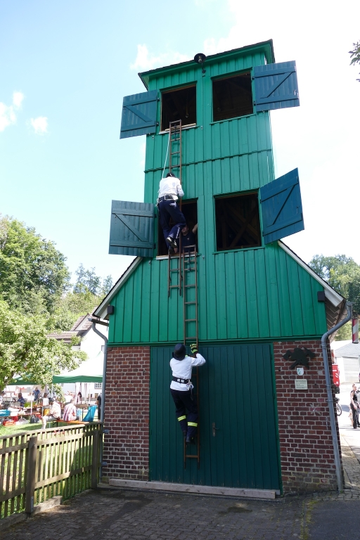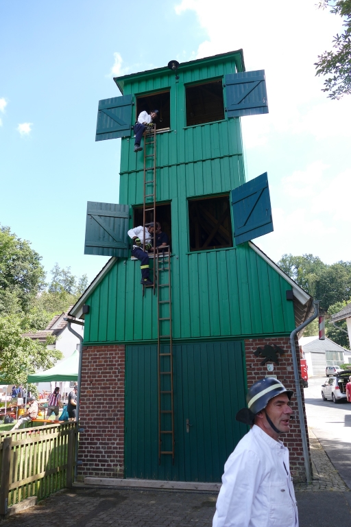 Am nahegelegenen Steigerturm des Spritzenhauses von 1912 zeigten Feuerwehrleute aus Langenholdinghausen, wie dereinst mit Hakenleitern auch höhere Gebäude zur Rettung von Menschen bestiegen werden konnten. Auch hier saß nach den „zackigen“ Befehlen des Gruppenleiters Bernd Zöller jeder Handgriff und Tritt – zügig ging es auf den schmalen Leitern an der Turmwand hinauf. Der Applaus des Publikums war der „Steigermannschaft“ sicher!
