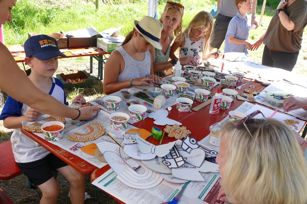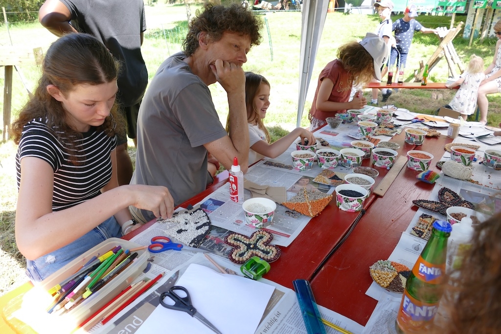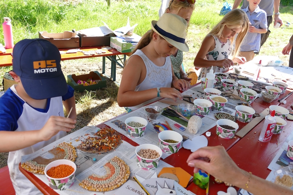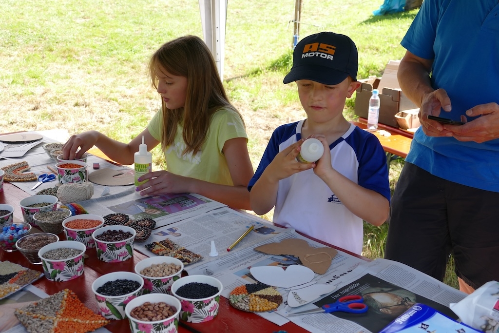 In der Wiese erfreuten sich währenddessen die Kinder an traditionellen Wurf- und Kegelspielen, am Nagelbalken oder dem Sägebock. Andere betätigen sich als Künstler und gestalten mit Geschick und Phantasie aus Körnern und Hülsenfrüchten ansprechende Schmuckbilder.