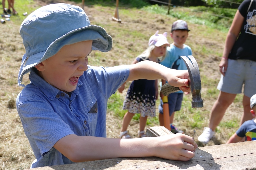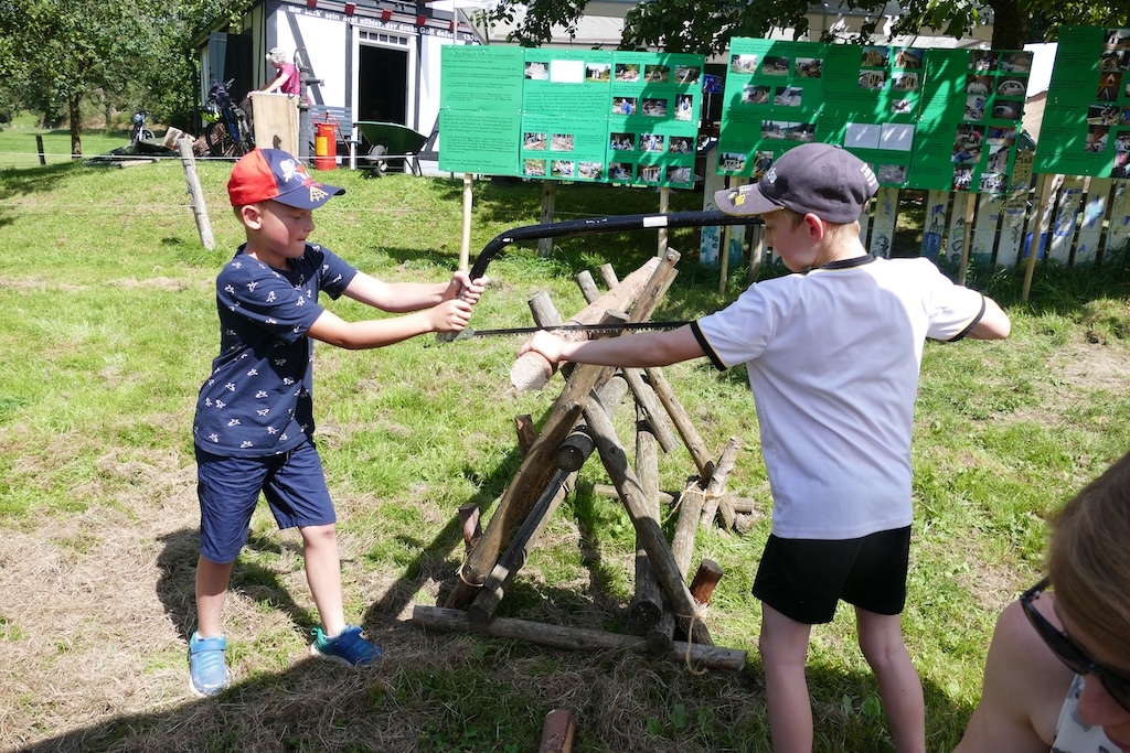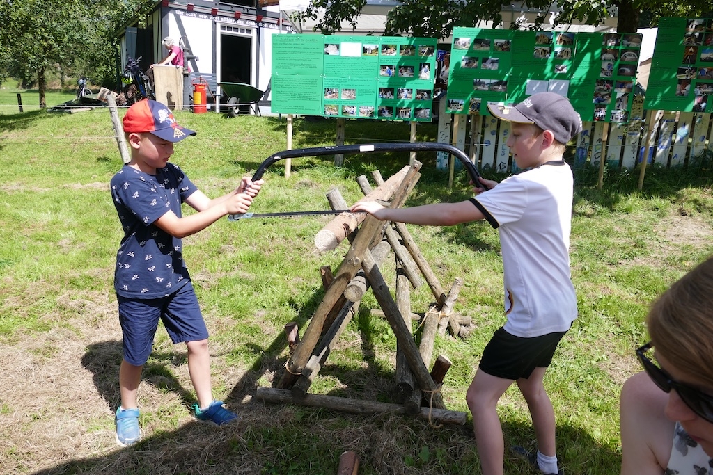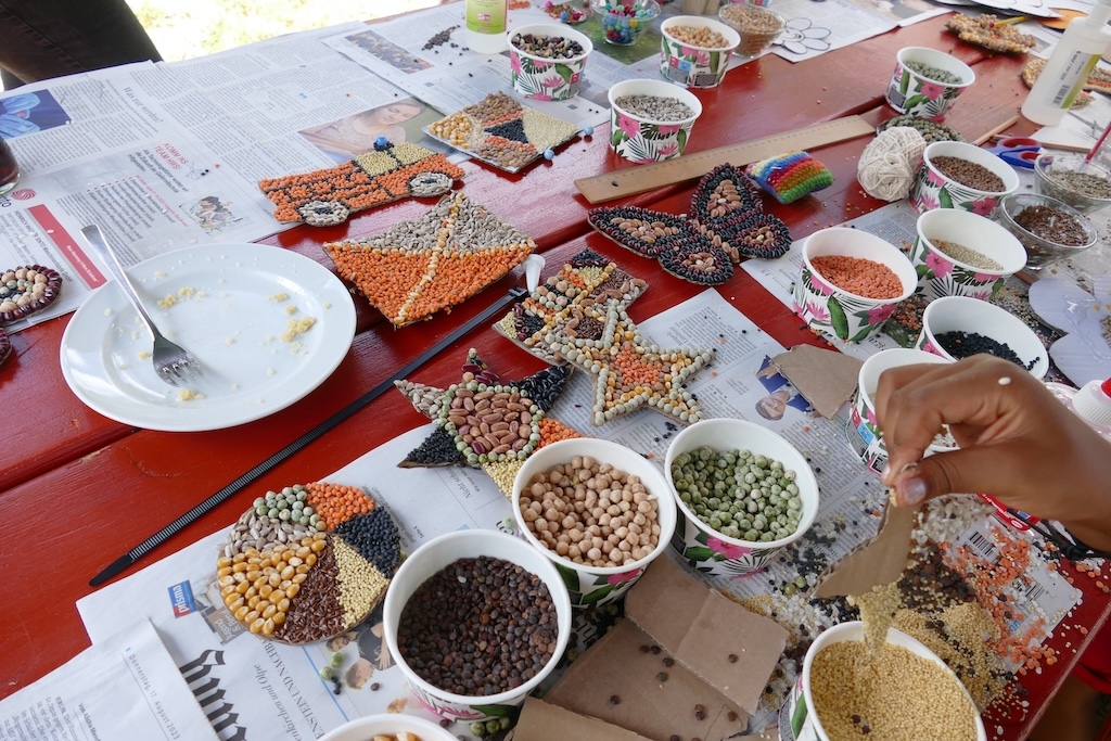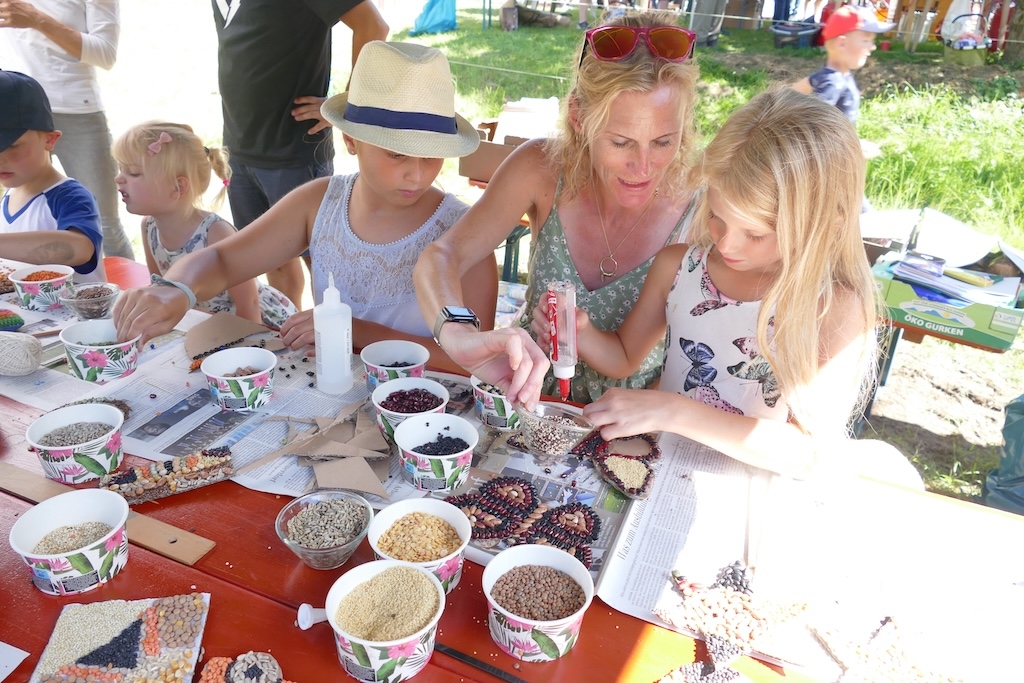 In der Wiese erfreuten sich währenddessen die Kinder an traditionellen Wurf- und Kegelspielen, am Nagelbalken oder dem Sägebock. Andere betätigen sich als Künstler und gestalten mit Geschick und Phantasie aus Körnern und Hülsenfrüchten ansprechende Schmuckbilder.