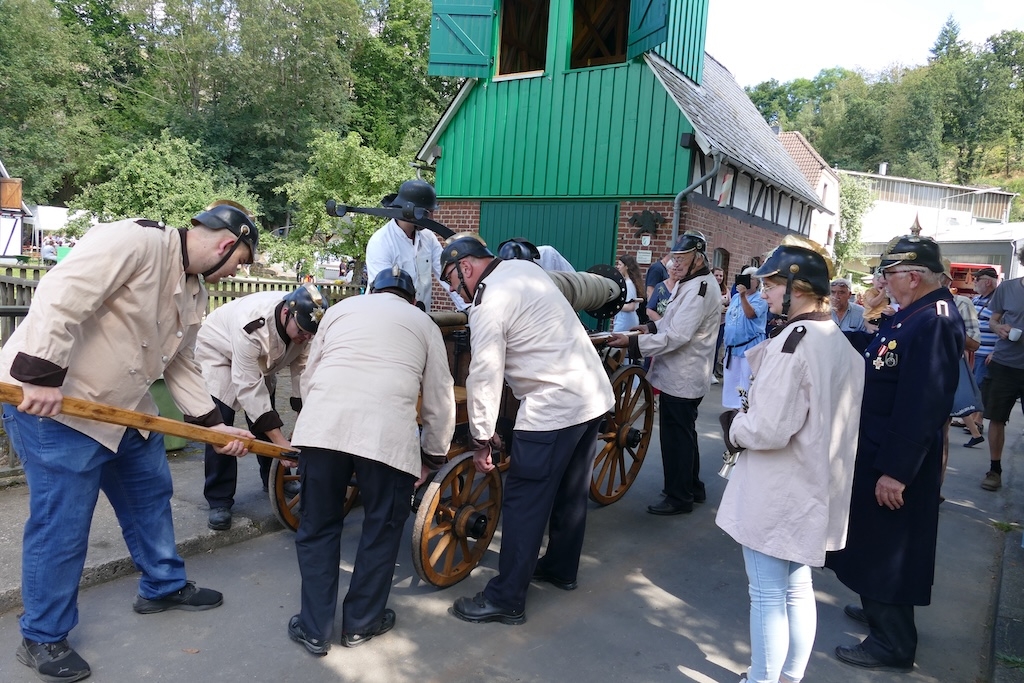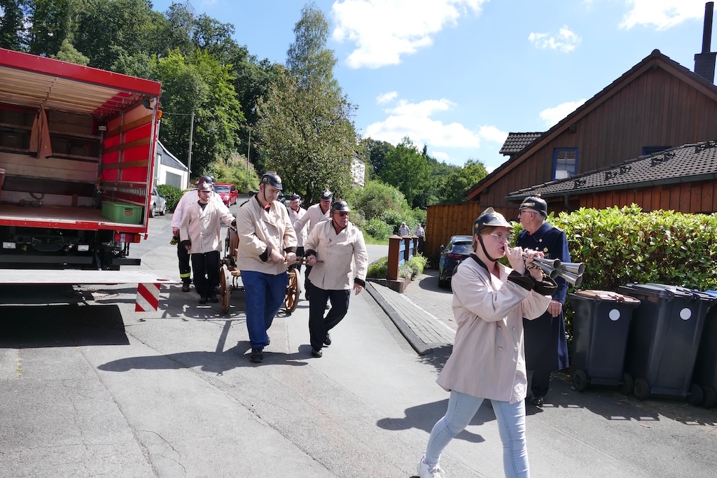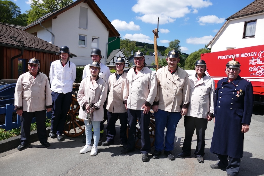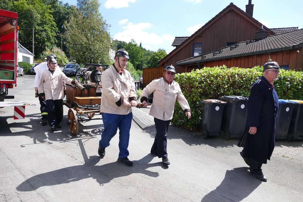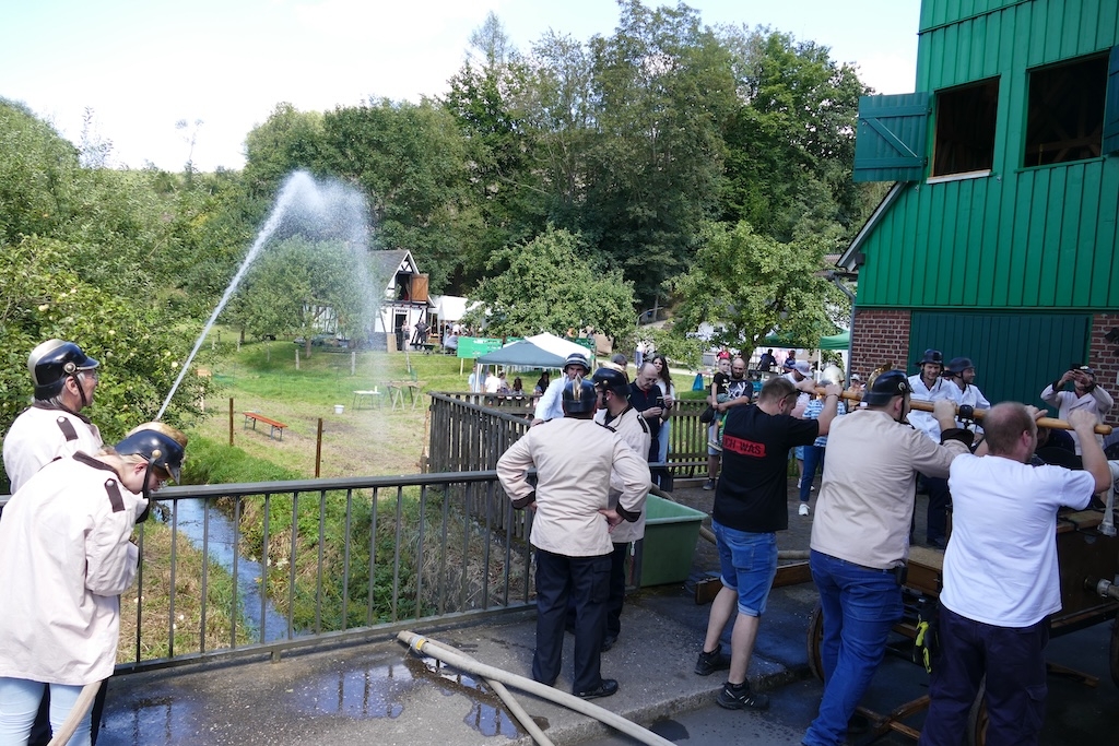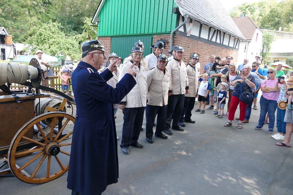 Als Partner des Arbeitskreises waren bei der Gestaltung des Festes diesmal die „Historische Feuerwehrgruppe Siegen e.V.“ und die „Steigermannschaft der Feuerwehr Langenholdinghausen“ mit dabei. Ihr Auftritte versetzten die Besucher zurück in längst vergangene Zeiten: Mit einer vom „Wehrleiter“ Dieter Müller und seinen Mannen in historischen Uniformen authentisch in Szene gesetzten Übung zeigte die herbeieilende Wehr mit einer von Hand gezogenen Feuerspritze aus dem Jahr 1884 ihre „Einsatzbereitschaft“. Wegen der kraftraubenden Bedienung der schweren Pumpe wurde auch gleich das Publikum zur Ablösung der Feuerwehrleute mit herangezogen. Fachkundige Erklärungen zum Ablauf und zum Erfolg derartiger Löscheinsätze in früherer Zeit schlossen sich an die Vorführung an.