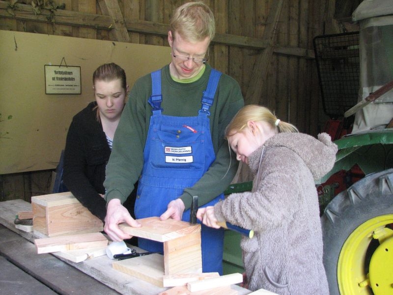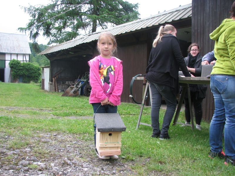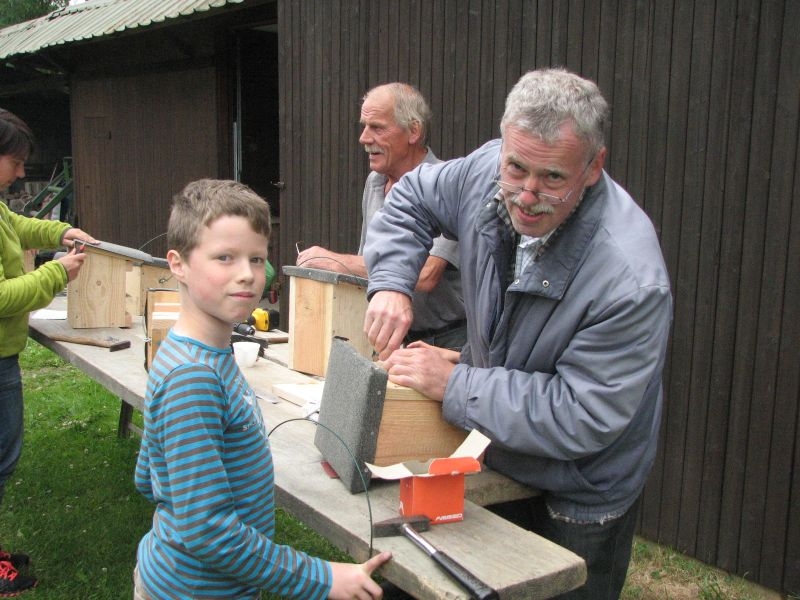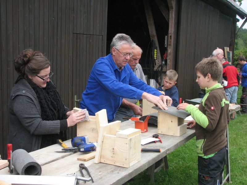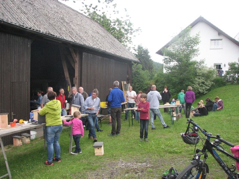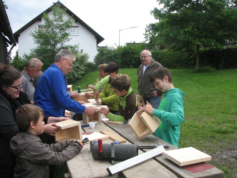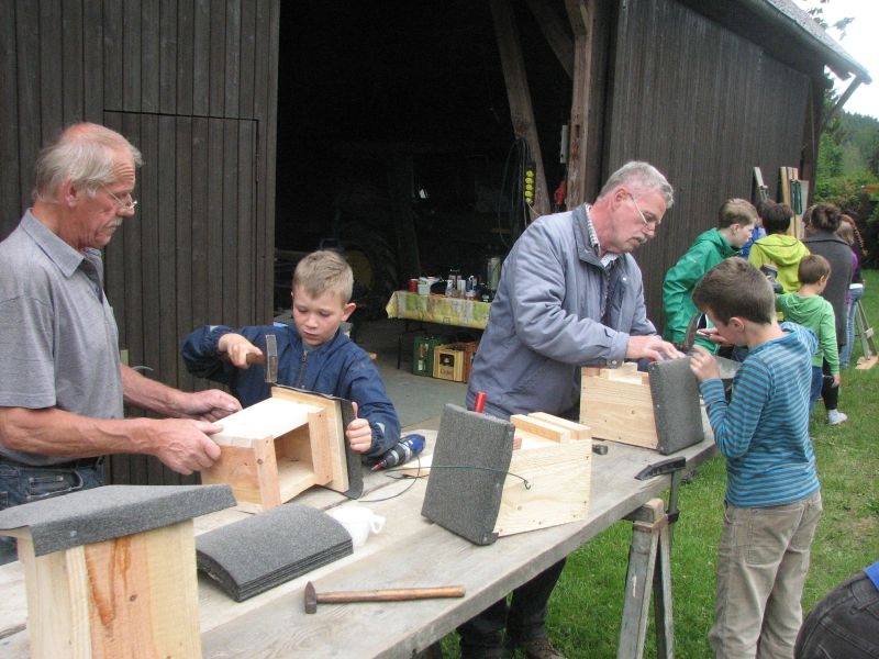 Vor „Gisselersch“-Scheune fanden sich am vergangenen Samstag zwanzig Kinder des Dorfes zusammen, um unter fachkundiger Anleitung Nistkästen für Vögel zu bauen. Eingeladen hierzu hatte der Arbeitskreis Dorferneuerung und Dorfgeschichte, von dessen Mitgliedern auch das Baumaterial zusammengestellt und vorbereitet worden war. Nach einigen Hinweisen zum Bau der Kästen und mit „handwerklichen Tipps“ versehen machten sich die Mädchen und Jungen mit Eifer an die Arbeit. Schon nach kurzer Zeit übertönte der Klang der Hämmer jedes Gespräch. Wenn auch beim Zusammennageln der Bretter der eine oder andere Nagel mal krumm wurde, im Umgang mit Hammer, Zange oder dem Akkuschrauber bewiesen die jungen Naturfreunde viel Geschick und Ausdauer. Unterstützt von einem Erwachsenen oder auch ganz allein von Kinderhand entstanden insgesamt 30 Nistkästen, die meisten davon für „Höhlenbrüter“ wie die Kohlmeise, aber auch für Vogelarten, die einem halb offenen Nistkasten den Vorzug geben, wie die Bachstelze, das Rotkehlchen oder der Zaunkönig. Geeignete Standorte für die neuen Nistkästen werden sich in den Gärten, Obstwiesen oder am Waldrand leicht finden lassen.