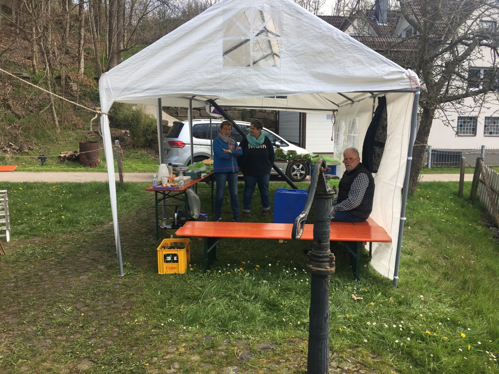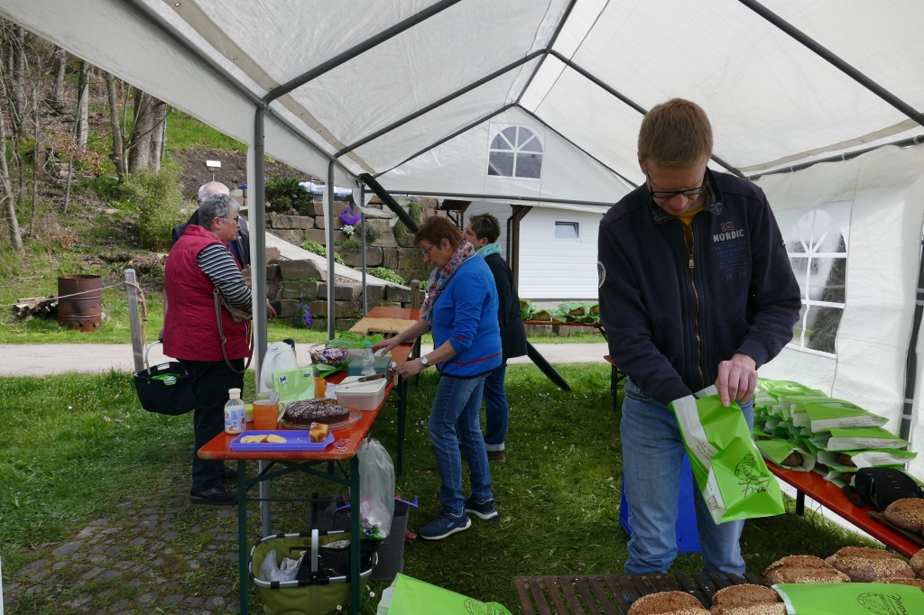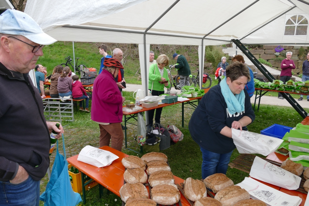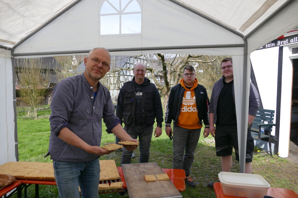 Bei guter Witterung konnten 245 Brote und vier Bleche Kuchen gebacken werden. Zwar mussten einige Kunden wieder an die Abholung des Brotes erinnert werden, letztendlich versäumten es aber lediglich zwei Kunden ihr Brot abzuholen, von denen zudem noch einer entschuldigt war: Es war an dem Tage erstmals Großvater geworden und hatte allein deshalb nicht zum Backes kommen können &! Beim Backtag kam erstmals unser neu erworbenes Verkaufszelt zum Einsatz, das diesmal nicht auf dem Weg, sondern unmittelbar vor dem Backes aufgeschlagen worden war. So werden zumindest beim Backtag Wanderer und Radfahrer auf dem vielgenutzten Weg entlang des Backhauses nicht behindert. Auch diesmal wieder erwies sich der Backtag als kommunikatives Element für die zahlreiche Kundschaft.