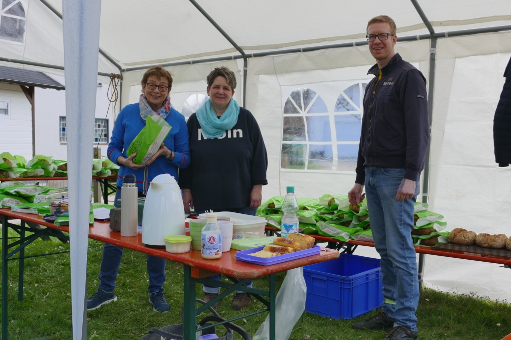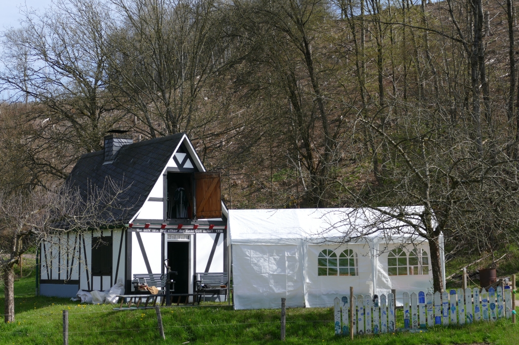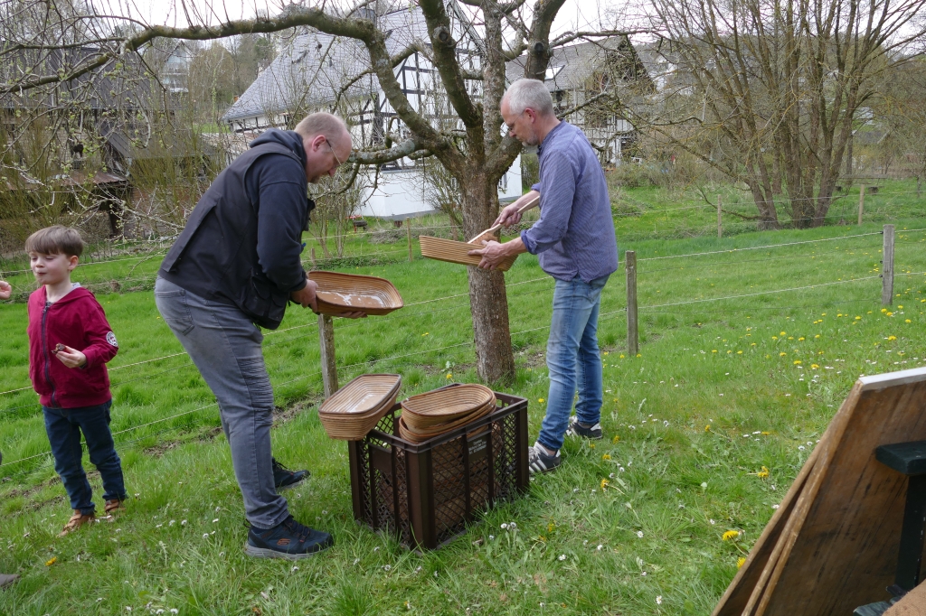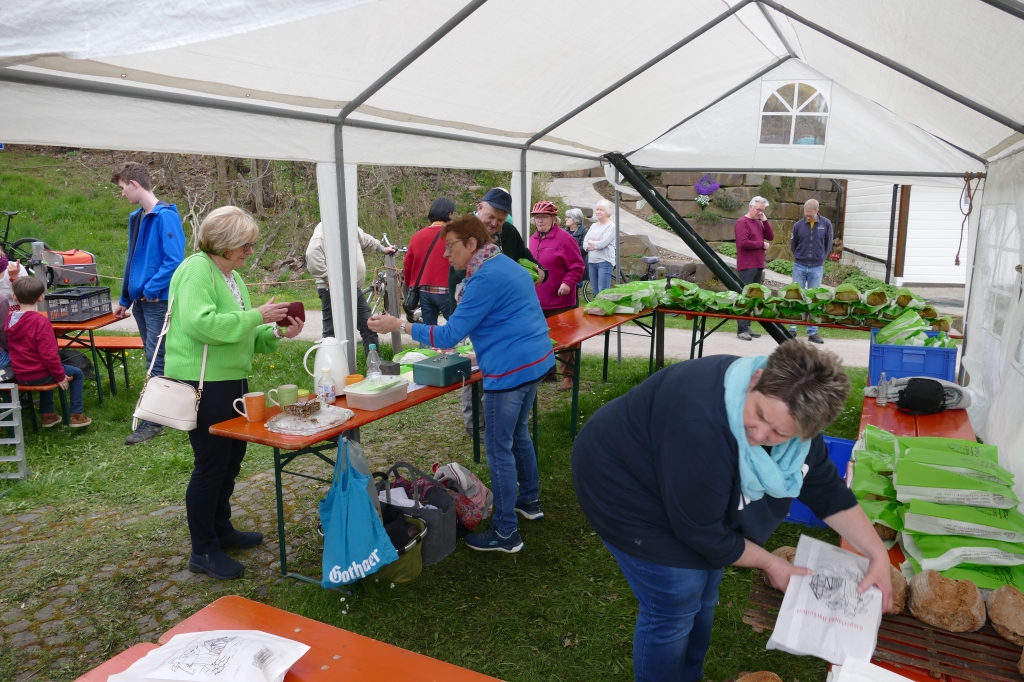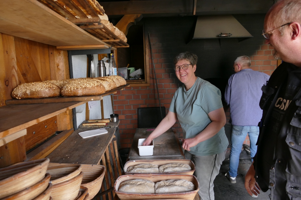 Bei guter Witterung konnten 245 Brote und vier Bleche Kuchen gebacken werden. Zwar mussten einige Kunden wieder an die Abholung des Brotes erinnert werden, letztendlich versäumten es aber lediglich zwei Kunden ihr Brot abzuholen, von denen zudem noch einer entschuldigt war: Es war an dem Tage erstmals Großvater geworden und hatte allein deshalb nicht zum Backes kommen können &! Beim Backtag kam erstmals unser neu erworbenes Verkaufszelt zum Einsatz, das diesmal nicht auf dem Weg, sondern unmittelbar vor dem Backes aufgeschlagen worden war. So werden zumindest beim Backtag Wanderer und Radfahrer auf dem vielgenutzten Weg entlang des Backhauses nicht behindert. Auch diesmal wieder erwies sich der Backtag als kommunikatives Element für die zahlreiche Kundschaft.