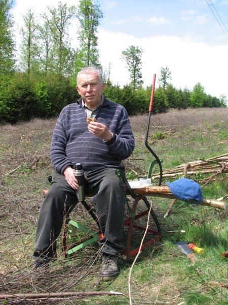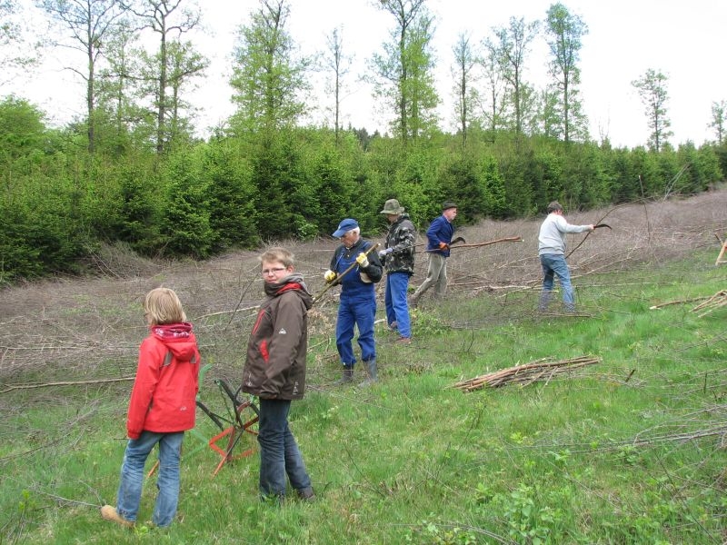 Geeignetes Gehölz fand sich diesmal auf einer erst kürzlich freigeschnittenen Fläche unter einer Hochspannungsleitung in der „Limbach“. Die noch schmiegsamen Birkenreiser wurden jetzt mit dem Knipp auf die richtige Länge gebracht und mit Hilfe der Schanzenbinder zusammen gebunden. Anstelle der gewundenen Birkenhölzer, „Wiere“ genannt, hält heute allerdings schlichtes Seil das Astwerk zusammen. Beim Binden der Schanzen stehen auch die jüngeren Helfer bereits „ihren Mann“. Nach gut fünf Stunden Arbeit und dem gewohnt zünftigen Kaffeetrinken im Wald konnten 90 Schanzen auf das Fuhrwerk verladen und in „Franzes“ - und „Kolwe“ Scheune zur Trocknung eingelagert werden. Der jährliche Bedarf für das Backen von Brot, Kuchen und Plätzchen im „Hollekusser“ Backes dürfte damit erneut gedeckt sein.