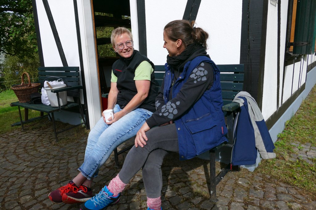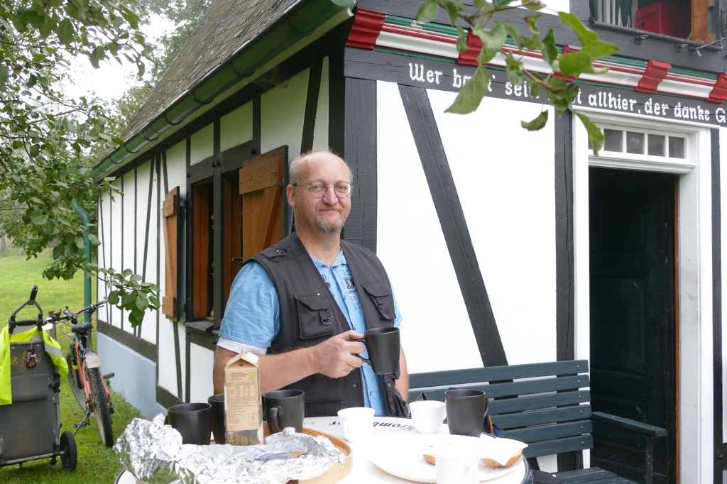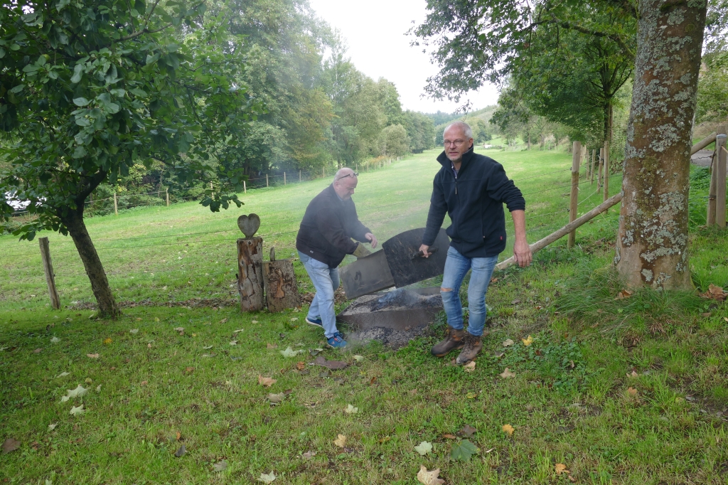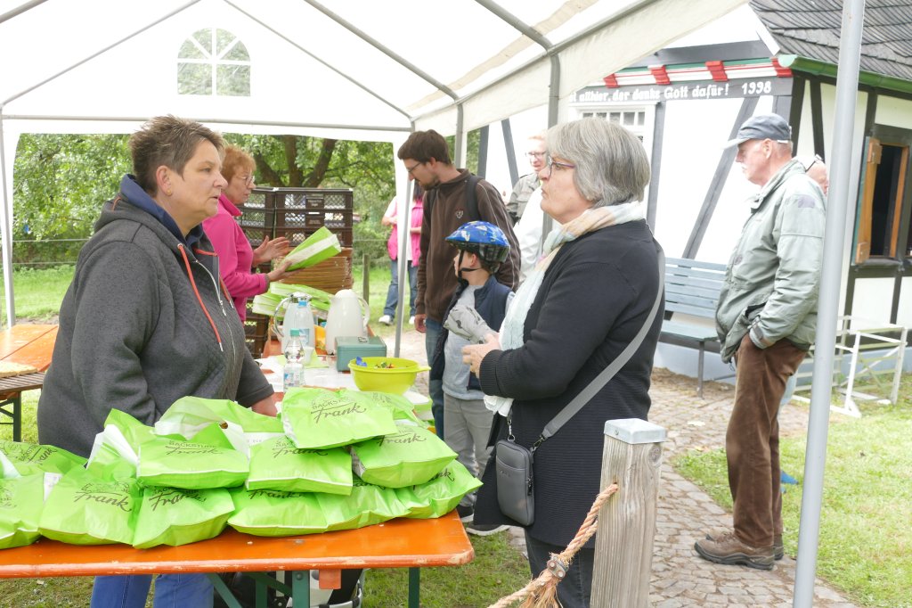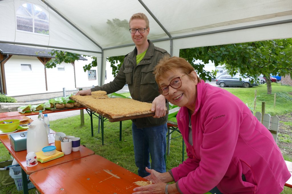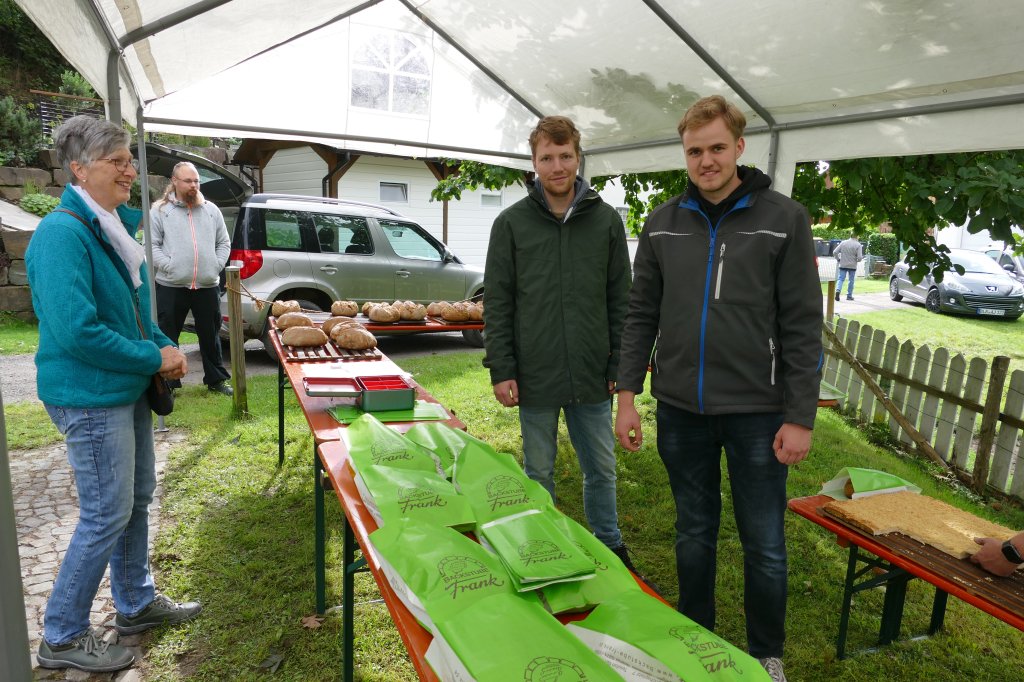 Die sich aufgrund des gleichzeitig stattfindenden "Dorftrödels" ergebenden Nachfragen nach unseren Broten mussten leider alle abschlägig beschieden werden, mehr als die in fünf Backgängen jeweils eingeschossenen und von unserer Kundschaft vorbestellten Brote können wir einfach nicht backen &! Auch diesmal wurde die "Mannschaft" am Backes während des Backtages von weiteren Mitgliedern unseres Arbeitskreises mit herzhaften und süßen Köstlichkeiten sowie Kaffee vortrefflich versorgt eine Aufmerksamkeit die aber auch "verdient" ist. Schließlich ist der Backtag für alle Beteiligten recht anstrengend: Für die Bäcker beginnt die Arbeit am Samstag immerhin schon um halb sechs Uhr in der Frühe. Und die Helfer beim Brotverkauf können erst nach der Abholung der letzten Brote gegen 18.00 Uhr ihren Verkaufsstand schließen.