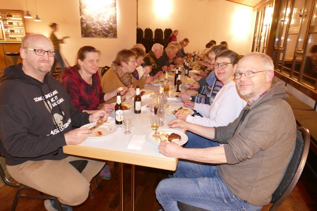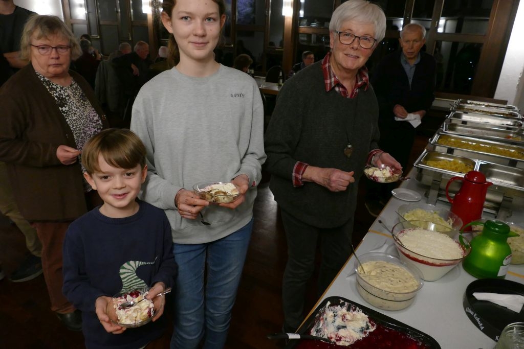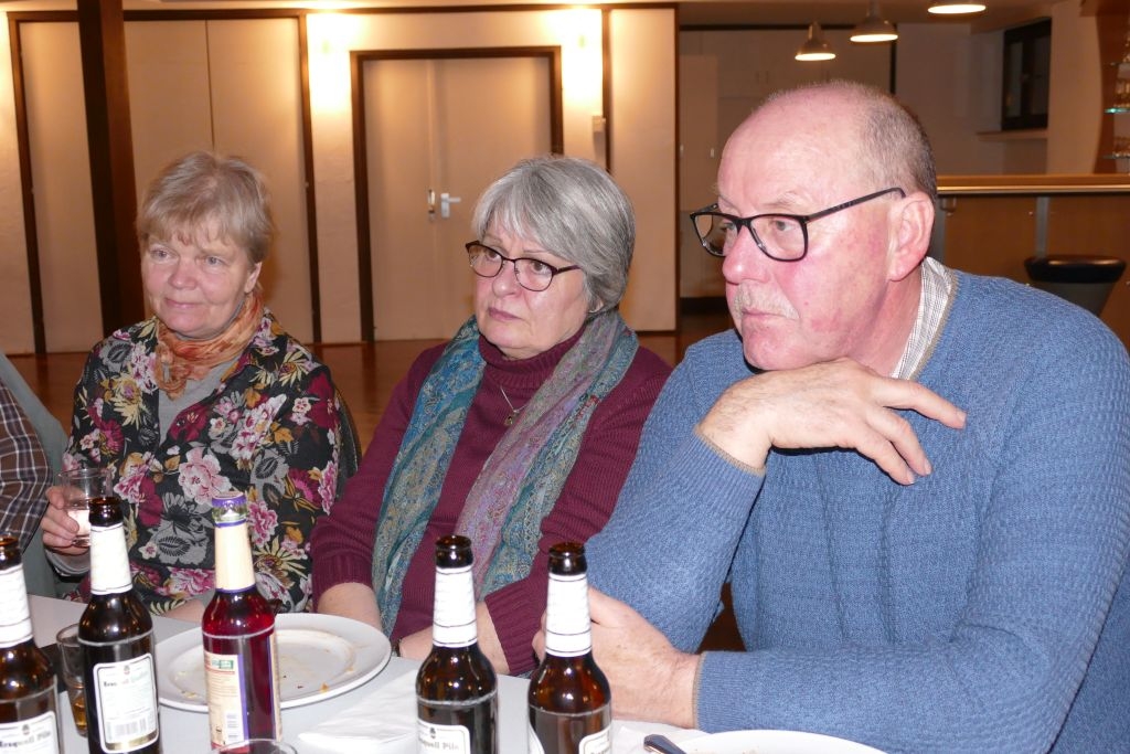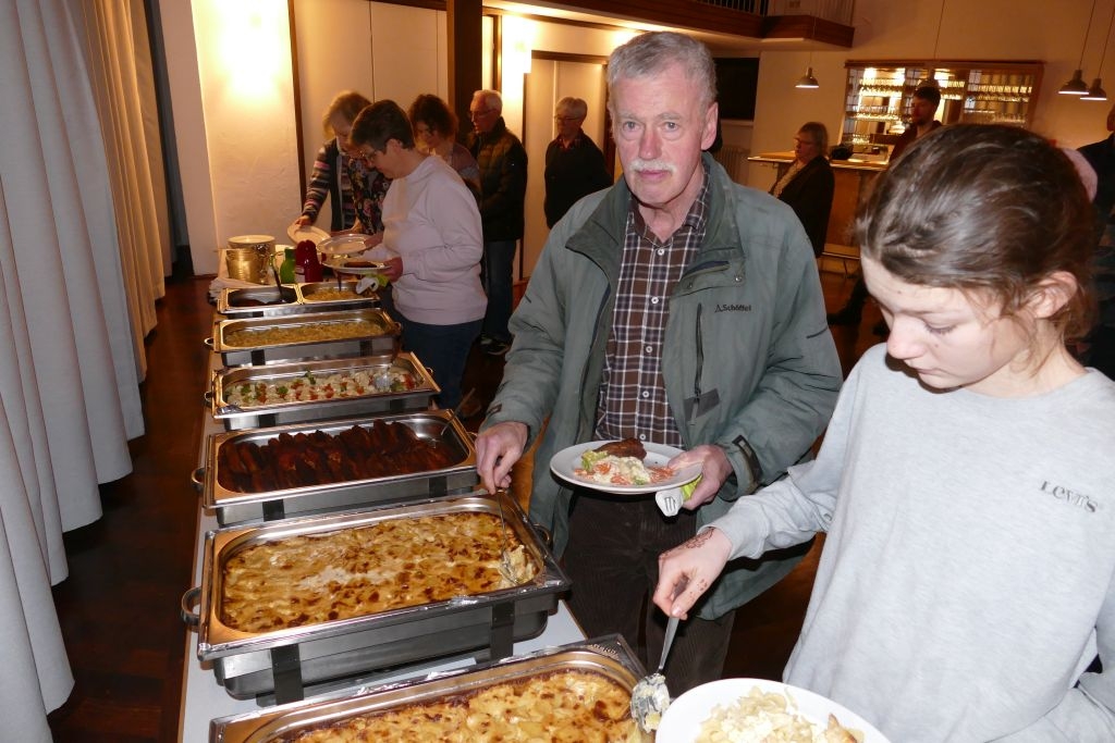 Der vorausgegangenen Wanderung durch die heimischen Fluren war indes nicht allzu viel Positives abzugewinnen, um die Wanderer war es rundherum feucht, von oben und auch von unten! Nichtdestotrotz kamen die Teilnehmer halbwegs pünktlich im DGH an, um sich mit den anderen, dort schon eingetroffenen Mitgliedern am bereits aufgebauten Buffet gütlich zu tun. Nach dem gemeinsamen Essen erfolgte ein Jahresrückblick in Wort und Bild. Anhand zahlreicher Fotos und Filmmitschnitte (Adventliches Konzert / Vortrag zur Vertreibung) ließ der Verein die Aktivitäten des Jahres 2022 Revue passieren. Die Teilnehmer erfreuten sich zudem an einem von Robin Ohrndorf unter Verwendung seiner Drohne gedrehten interessanten Kurzfilm über Langenholdinghausen. Daran schloss sich der formale Teil der Jahreshauptversammlung an, mit der Vorstellung aller laut Satzung vorzutragenden Berichte und der Wahl des Vorstandes und der Kassenprüfer.