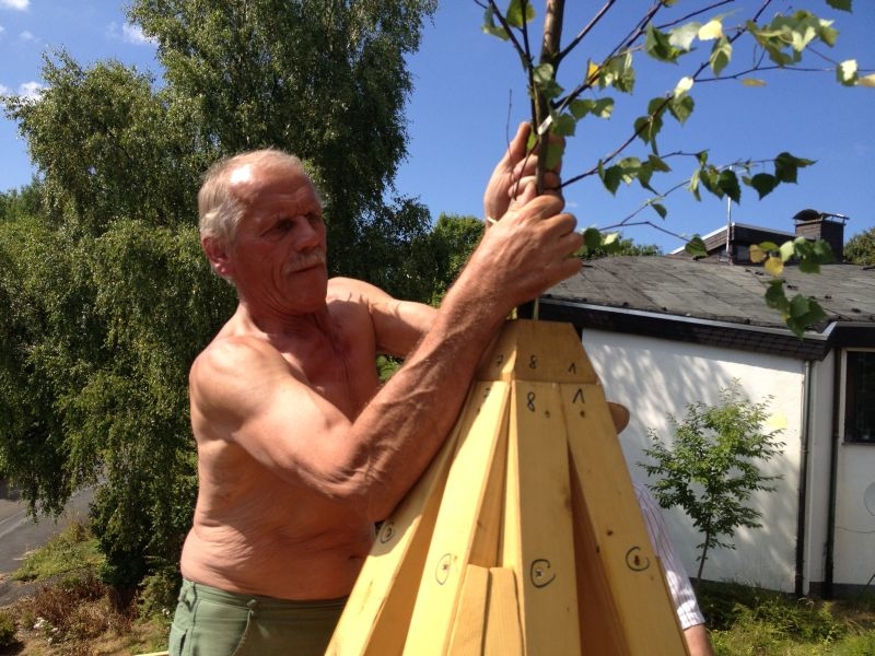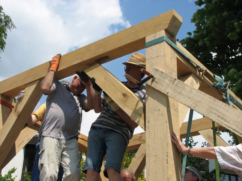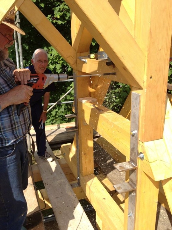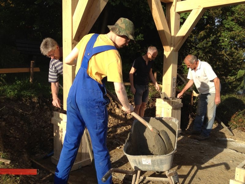 Am 11. April begannen mit dem Fällen mehrerer Eichen am "Goldseifen" die praktischen Arbeiten zur Realisierung des Objektes. Der Bau des Turmes beschäftigte uns von April bis in den November 2013. Fast alle notwendigen Arbeiten wurden von den Mitgliedern unserer Gruppe selbst ausgeführt - von der Planung bis zum letzten Pinselstrich. Mehr als 1020 Arbeitsstunden investierten die Helfer in ihr „Turmprojekt“. Jeder trug nach seinen Möglichkeiten zum Gelingen des Vorhabens bei. Die für das Ständerwerk erforderlichen Eichen wurden vor Ort gefällt, mit dem Mobilsägewerk zu Balken geschnitten und gemeinsam verzimmert. Lediglich die Eindeckung des Daches und des Dachreiters mit Naturschiefer blieb dem erfahrenen Fachmann vorbehalten. Und mit dieser Arbeit vollbrachte der 71jährige Dachdeckermeister Willi Loos erneut ein Meisterstück. Das Ziel, ein Zeugnis traditioneller handwerklicher Baukunst und einen „Blickfang“ im Ortsbild zu schaffen, wurde durch die Arbeiten einmal mehr erreicht. Die abschließende Gestaltung und Eingrünung des Turmumfeldes erfolgt im Frühjahr 2014.