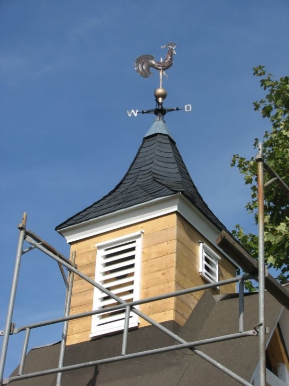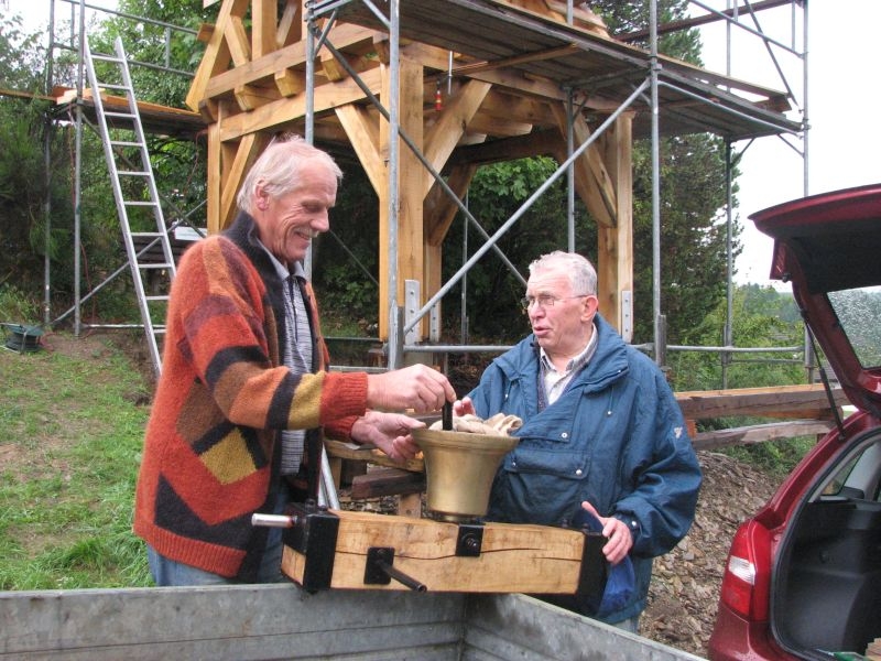 Am Anfang des Projektes stand eine insbesondere von unserem Mitstreiter Kurt Pfennig favorisierte Idee: Der Glockenturm der einstigen Schulkapelle sollte neu entstehen und einer - zunächst noch nicht feststehenden - Verwendung zugeführt werden. Im Sommer 2010 wurde deshalb mit der Materialbeschaffung und schon bald darauf mit den Bauarbeiten bei "Roenstatts" begonnen. Am 22. Aug. 2010 konnte das Turmgerüst mit dem als Original erhalten gebliebenen kupfernen Hahn und einer Glocke - einem Zufallsfund - während des "Backesfestes" erstmals der Öffentlichkeit präsentiert werden. Im Rahmen des am 18.und 19. September 2010 in Siegen stattfindenden NRW-Tages mit etwa 400 000 Besuchern aus nah und fern bildete das Turmgerüst mit Glocke und Hahn den idealen Blickfang für unseren stark frequentierten Stand zum Thema "Dorferneuerung - Der Heimat eine Zukunft geben". Im Jahr darauf kam das Turmgerüst ein weiteres Mal zum Einsatz - diesmal während des Ortsjubiläums von Bürbach. Gerne waren wir der Bitte der dortigen Heimatfreunde gefolgt, ihr Fest am 1. / 2. Okt. 2011 mit unserem Glockenturm zu bereichern. Danach wurde der Turm erneut demontiert und in "Schusdersch"-Scheune zwischengelagert. Der anfänglich gehegte Wunsch, den Dachreiter wieder auf das Dach der einstigen Kapellenschule zu setzen, hatte sich nach Gesprächen mit dem Besitzer des Anwesens zwar zerschlagen, aber der Gedanke an eine weitere Verwendung des Turmes, einen möglichen neuen Standort und die Gestaltung eines solchen Objektes ließ unseren Arbeitskreis nicht ruhen: Nach vielen Überlegungen und Diskussionen, Nachfragen und zahlreichen Gesprächen mit Grundeigentümern und Behörden konnten wir im am 25. März 2013 den Bauantrag für den Glockenturm bei der Stadt Siegen einreichen. Parallel hierzu waren die Bürger und Vereine vor Ort umfassend über das Vorhaben informiert worden, wobei sich keinerlei Einwendungen ergaben.