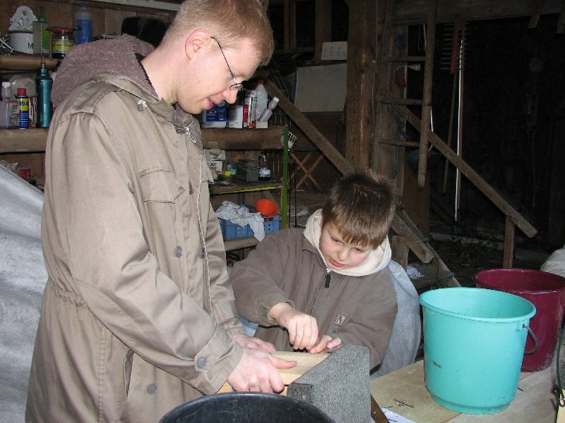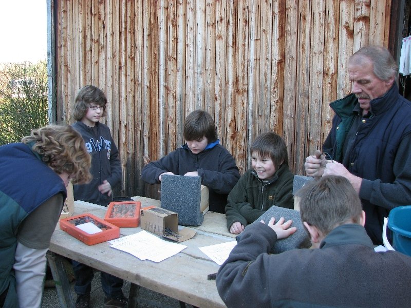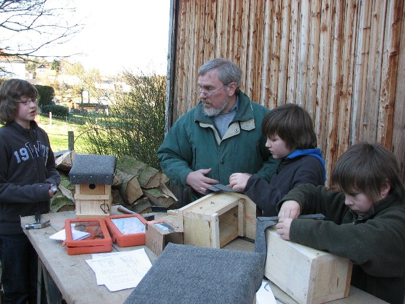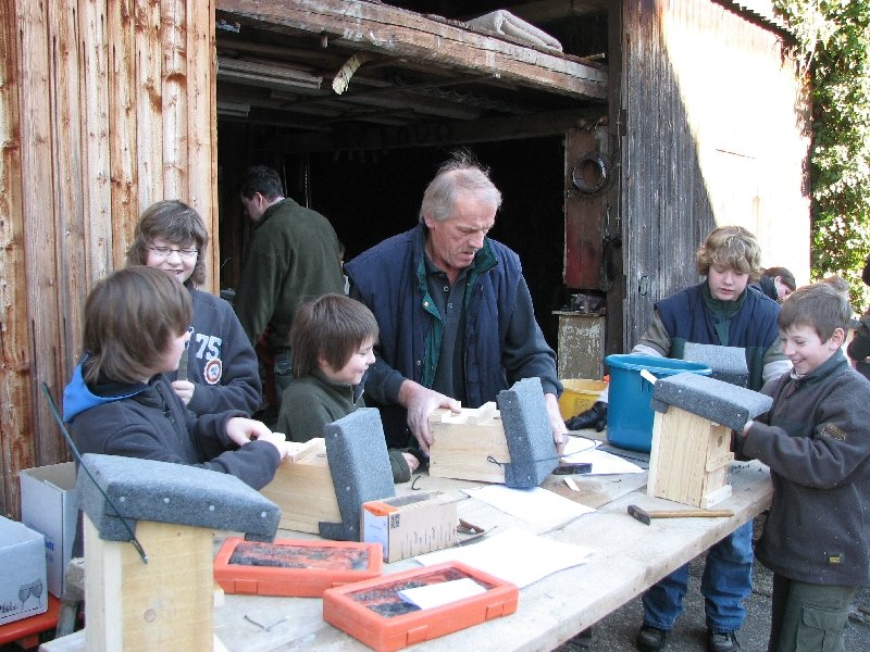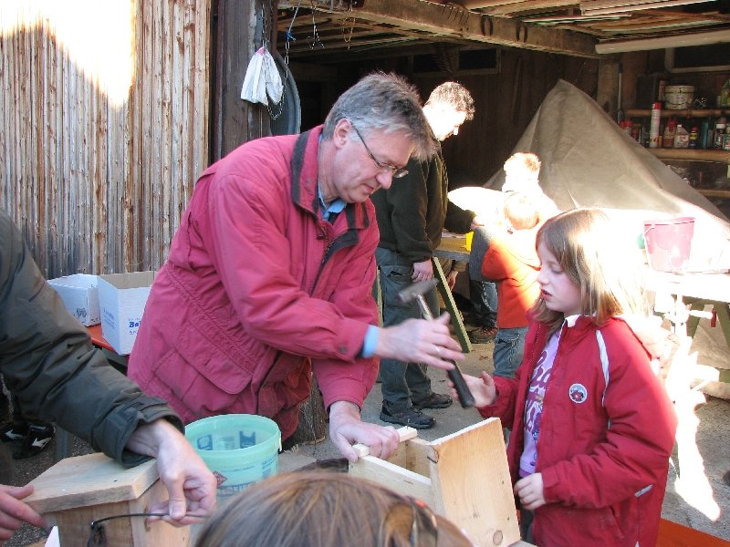 Vom Arbeitskreis Dorferneuerung und Dorfgeschichte war die Aktion geplant und das Baumaterial vorbereitet worden. Nach den Erläuterungen zur Vorgehensweise beim Bau der Kästen und versehen mit handwerklichen Tips machten sich die Jungen und Mädchen mit Eifer an die Arbeit. Schon bald übertönte der Klang der Hämmer jedes Gespräch. Auch wenn beim Zusammennageln der Bretter der eine oder andere Nagel mal krumm wurde, im Umgang mit Hammer und Zange zeigten die jungen Naturfreunde sehr viel Geschick und Ausdauer. Ganz allein von Kinderhand - oder unterstützt von einem Erwachsenen - entstanden insgesamt 25 Nistkästen. Nach getaner Arbeit waren Kakao und Kuchen als Stärkung willkommen. Rechtzeitig vor Beginn der Brutzeit wollen die jungen Helfer die Nistkästen in den Gärten, Obstwiesen oder am Waldrand aufhängen.