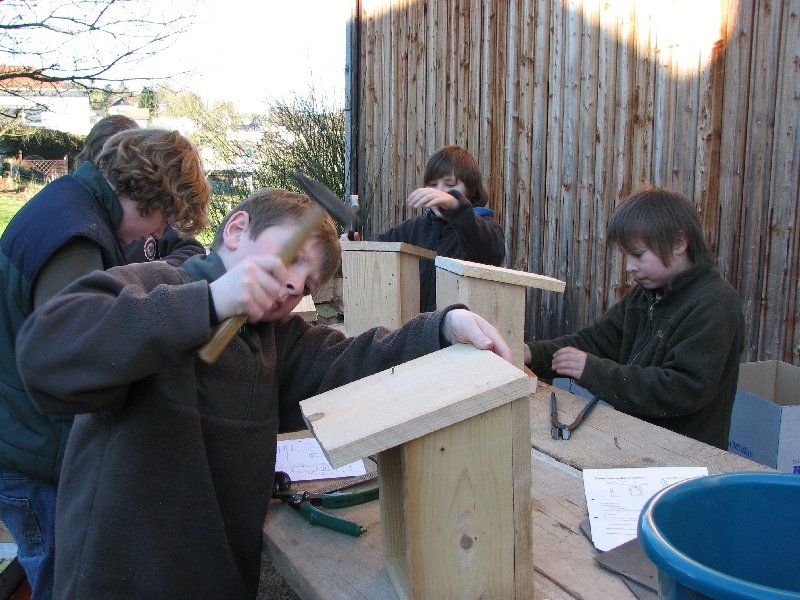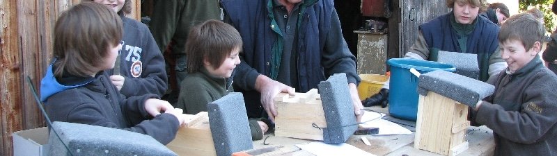 Jungen und Mädchen aus  Langenholdinghausen bauen Nistkästen für Vögel