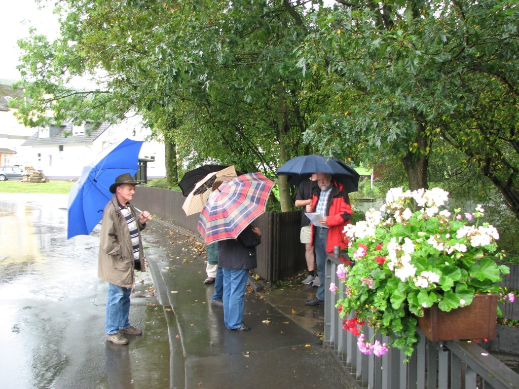 Ihren Anfang nahm die Begehung in der Schuhmacherwerkstatt bei „Schusdersch“, ihr Ende fand sie mit einer Besichtigung von „Möllersch“ Haus und einem gemeinsamen Kaffeetrinken daselbst. Beeinträchtigt wurde die Veranstaltung durch das sehr schlechte Wetter: Aufgrund des starken Dauerregens musste die Begehung schließlich abgekürzt werden. Entschädigt wurden die Teilnehmer allerdings durch den Besuch bei „Möllersch“ und die interessanten Ausführungen von Harald Heck zur Geschichte seines Hauses und dem aktuellen Stand der Renovierungsarbeiten. (Bilder siehe hier)
