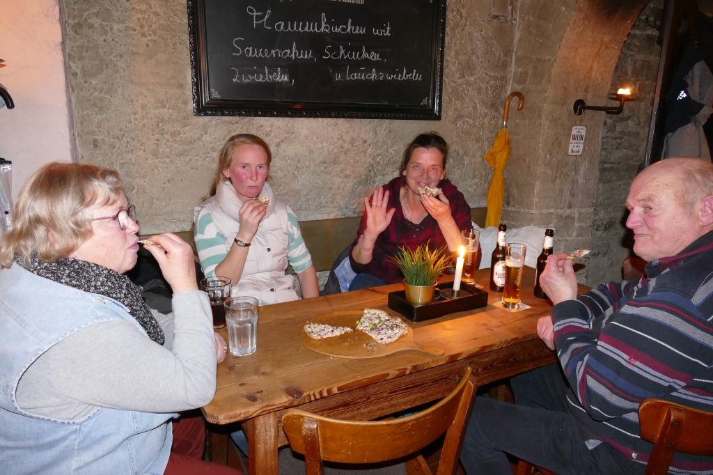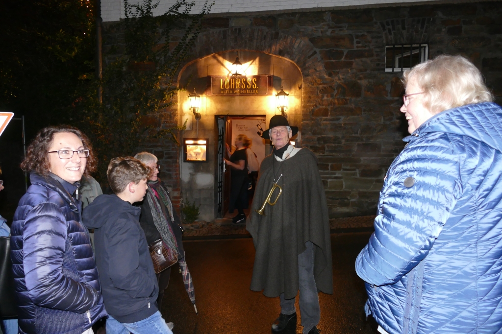 Getroffen wurde sich um 19.00 Uhr in Löhrsss Altem Weinkeller, Hainstr. 1- nahe dem ehem. Laternchen- , von dort wurde die Gruppe vom Nachtwächter zur Führung abgeholt und daselbst wieder hingebracht. Zur vor- und nachherigen Verköstigung wurden im urig eingerichteten Weinkeller Flammkuchen! Serviert. Während des kurzweiligen Rundganges mit dem Nachtwächter erfuhren die Teilnehmer allerhand Wissenswertes aus der Geschichte der Stadt Siegen, dazu zahlreiche interessante Anekdoten.