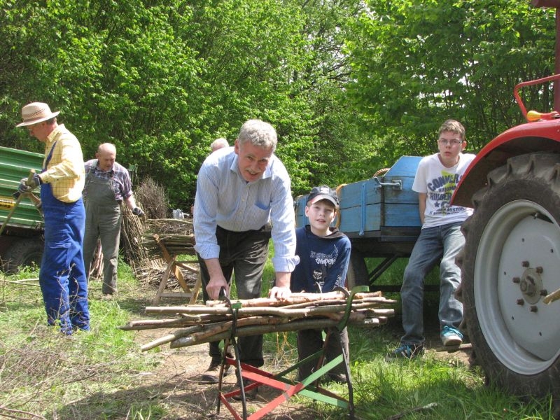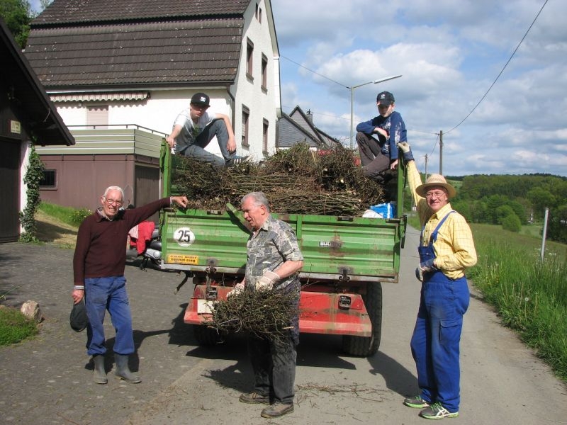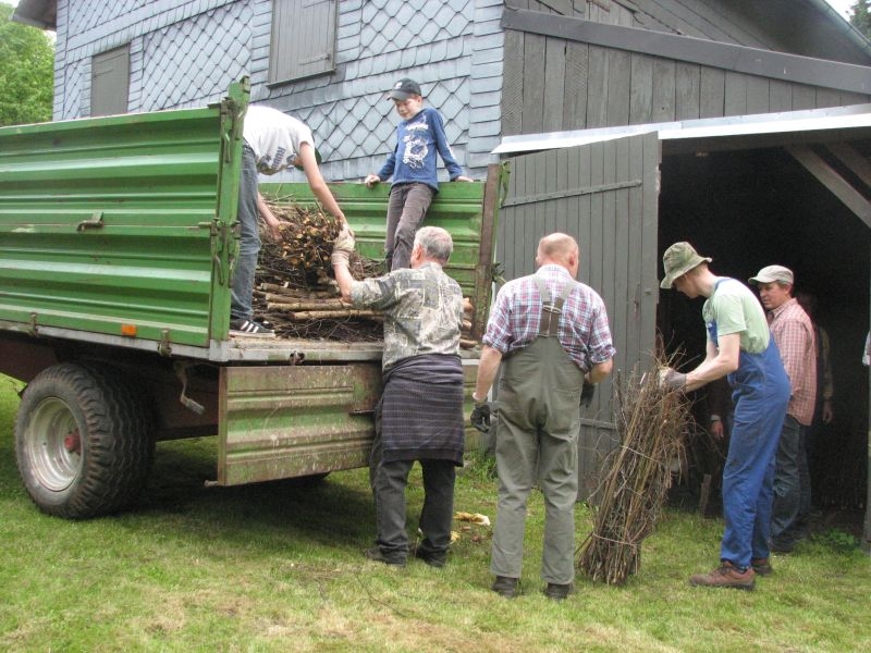 Mit dem Knipp wurden die Birkenreiser auf die richtige Länge gebracht und mit Hilfe der Schanzenbinder zusammen gebunden wurden. Zum gemeinsamen Schanzenmachen gehört natürlich auch ein zünftiges Kaffeetrinken im Wald. Danach ging es dann auf dem mit Schanzen beladenen Wagen zurück ins Dorf. Eingelagert wurden die frischen Schanzen in der Scheune von „Kolwe“. Hier können sie bis zu ihrer Verwendung im Steinofen gut durchtrocknen. Indem gleich mehrere Mitglieder des Arbeitskreises in ihren Gärten oder Waldstücken eine größere Zahl von Schanzen gebunden hatten und diese zu dem allgemeinen Bestand an Schanzen beisteuerten, konnten die Vorräte in diesem Frühjahr um etwa 180 Schanzen aufgestockt werden.