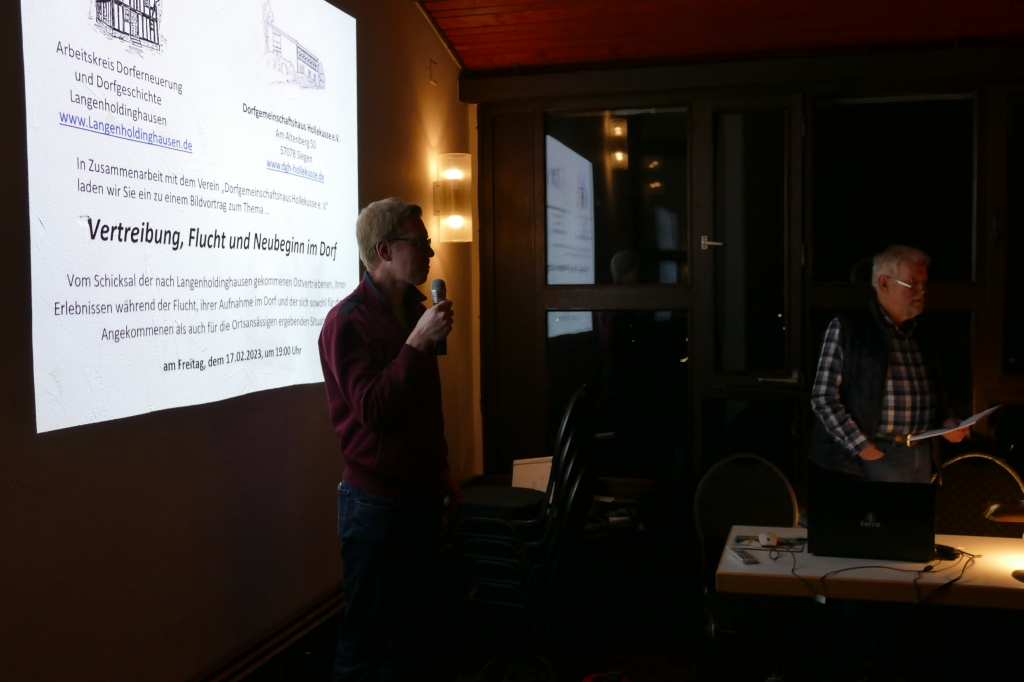 Vortrag zum Schicksal der nach Langenholdinghausen gekommenen OstvertriebenenWie sich in der Geschichte eines Dorfes und der dort lebenden Menschen die Geschichte einer Nation, Europas und der Welt widerspiegelt, zeigte ein im Dorfgemeinschaftshaus am „Alten Berg“ gehaltener Bildvortrag. Darin ging es um das Schicksal der als Folge des Zweiten Weltkrieges nach Langenholdinghausen gekommenen Ostvertriebenen. Unter dem Titel „Vertreibung, Flucht und Neuanfang im Dorf“ hatten der Verein „Arbeitskreis Dorferneuerung und Dorfgeschichte“ und der Verein „Dorfgemeinschaftshaus Hollekusse e. V.“ gemeinsam zu der Veranstaltung eingeladen.