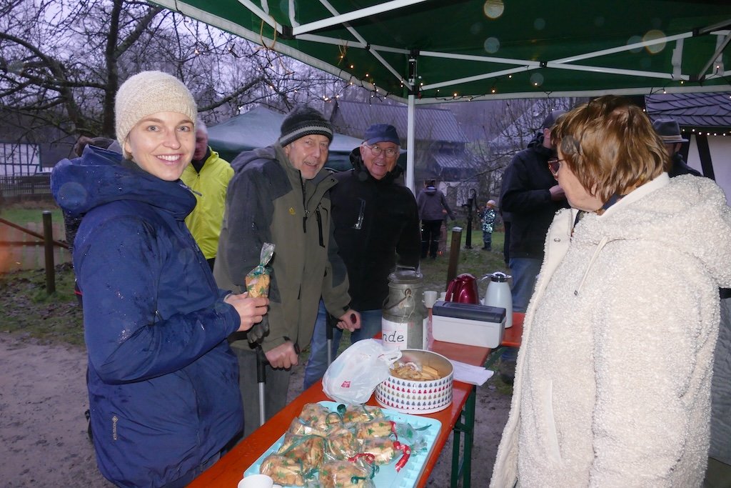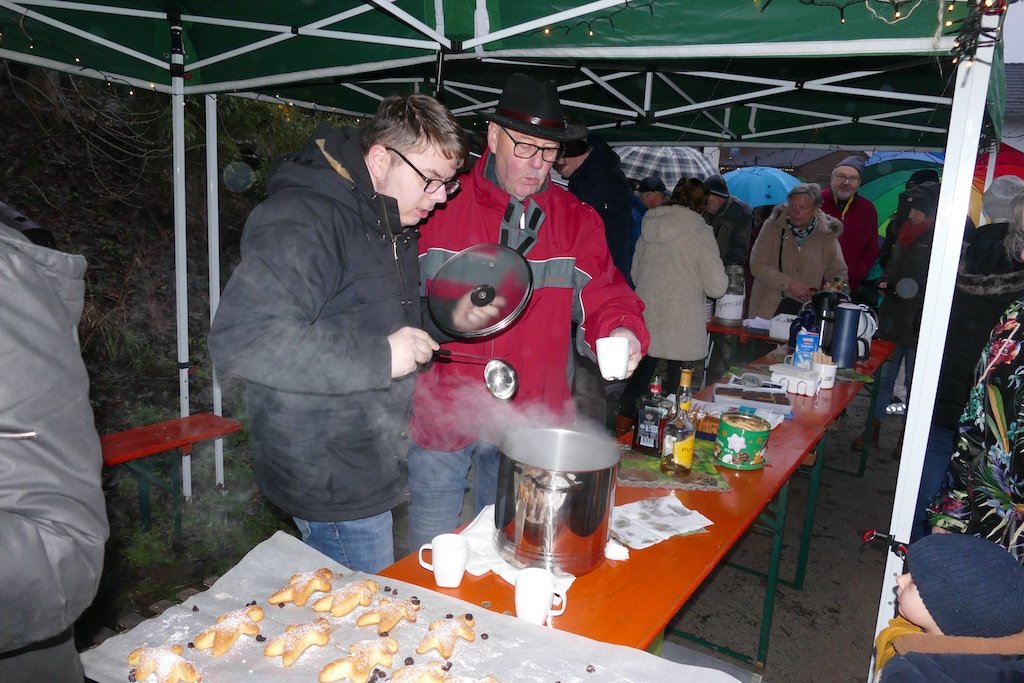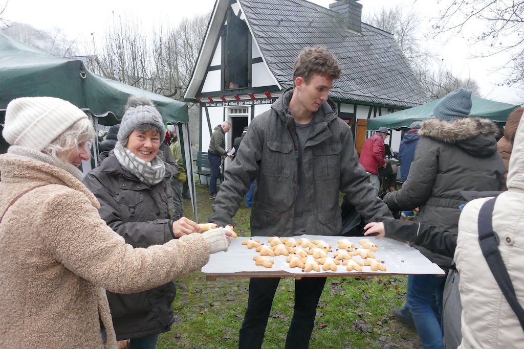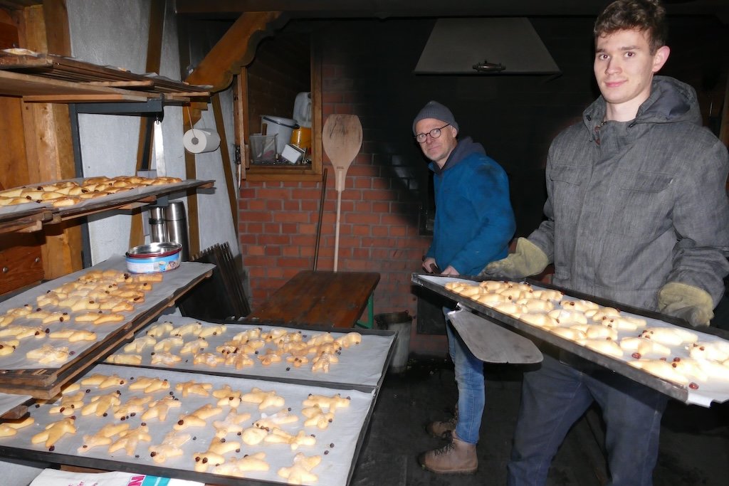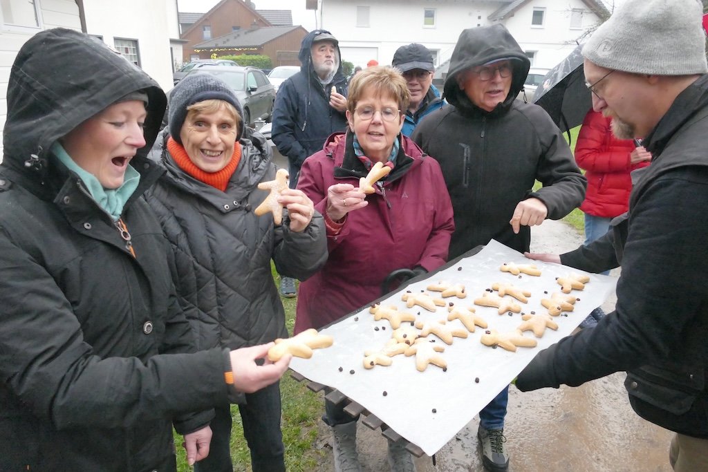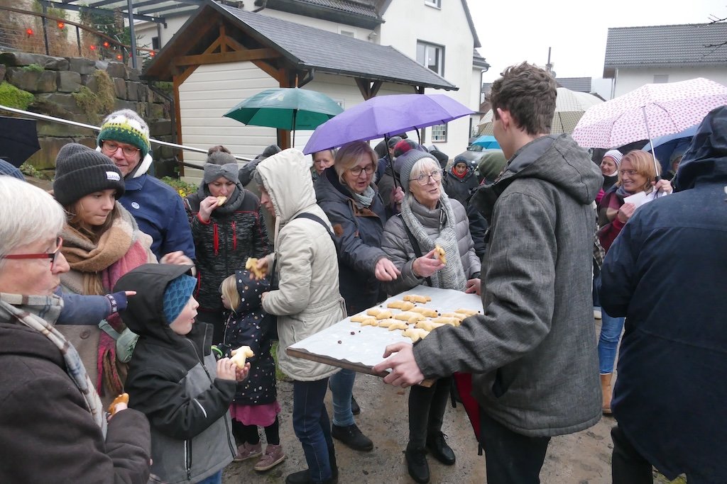 Das am Vortag von den Helferinnen und Helfern des Arbeitskreises in „Schusdersch“ Küche und im Backes „fabrizierte“ Spritzgebäck fand während und nach dem Konzert dankbare Abnehmer. Ebenso trafen die am Adventsonntag aus guten Zutaten frisch gebackenen Stutenmänner den Geschmack des Publikums. Mit Kaffee, heißem Kakao und Apfelpunsch gut versorgt, konnte selbst der Nieselregen der Veranstaltung keinen Abbruch tun. Die für Plätzchen, Kuchen und Kaffee eingegangenen Spenden werden wieder einem sozialen Zweck zugeführt. Selbstgebackene Plätzchen aus dem Backes erhielten auch die älteren Mitbürger im Dorf – sie wurden ihnen an den darauffolgenden Tagen zugestellt.