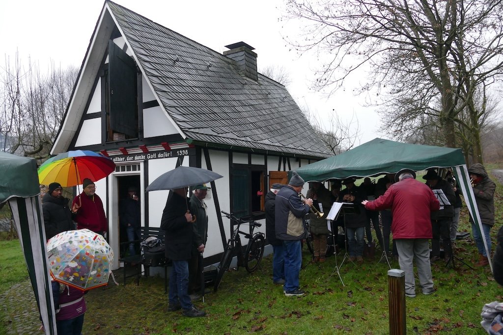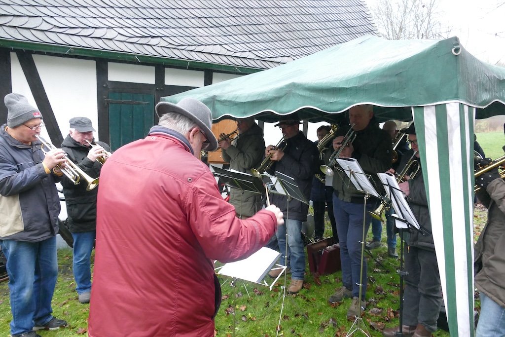 Adventliche Musik erfreute am 3. Advent beim Backes am „Zinnwald“ wieder zahlreiche Gäste aus dem Dorf und der Umgebung. Auch diesmal hatten der Arbeitskreis Dorferneuerung und Dorfgeschichte und der Posaunenchor Alchen-Langenholdinghausen das stimmungsvolle Zusammensein gemeinsam organisiert. Entstehung und Bedeutung der vom Posaunenchor vorgetragenen Lieder wurden vom Chorleiter anschaulich erläutert, zuvor verteilte Liedtexte erleichterten auch den weniger „textfesten“ Sängerinnen und Sängern das Mitsingen.