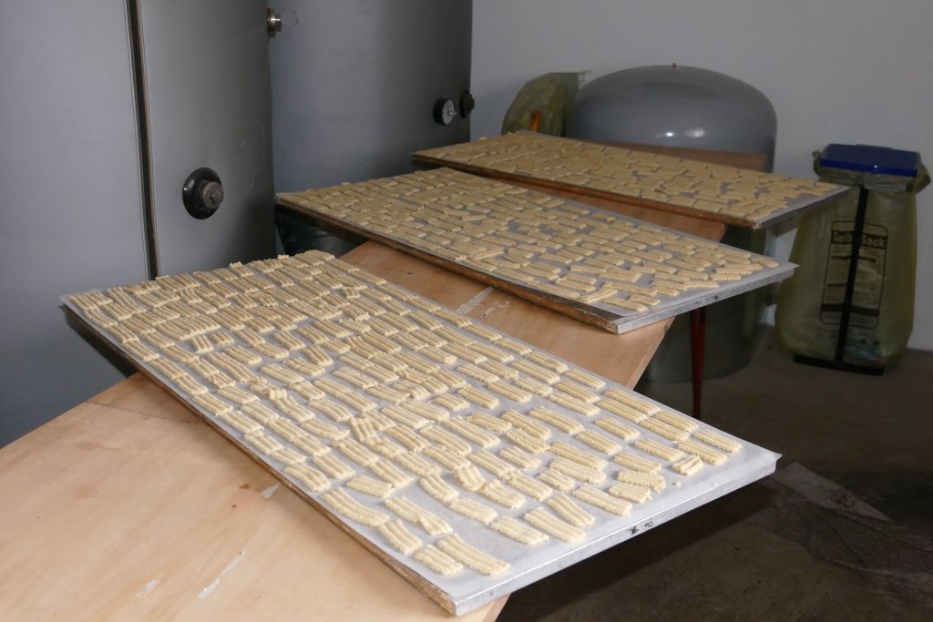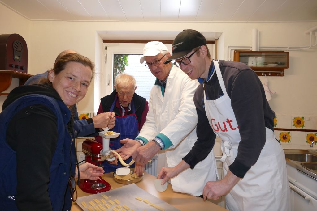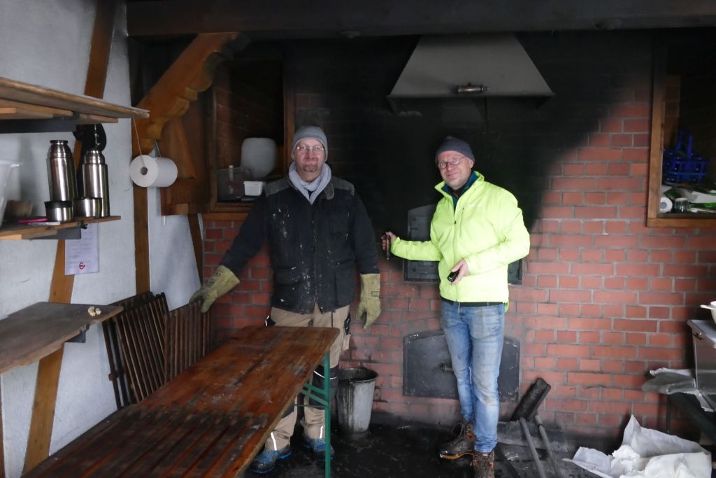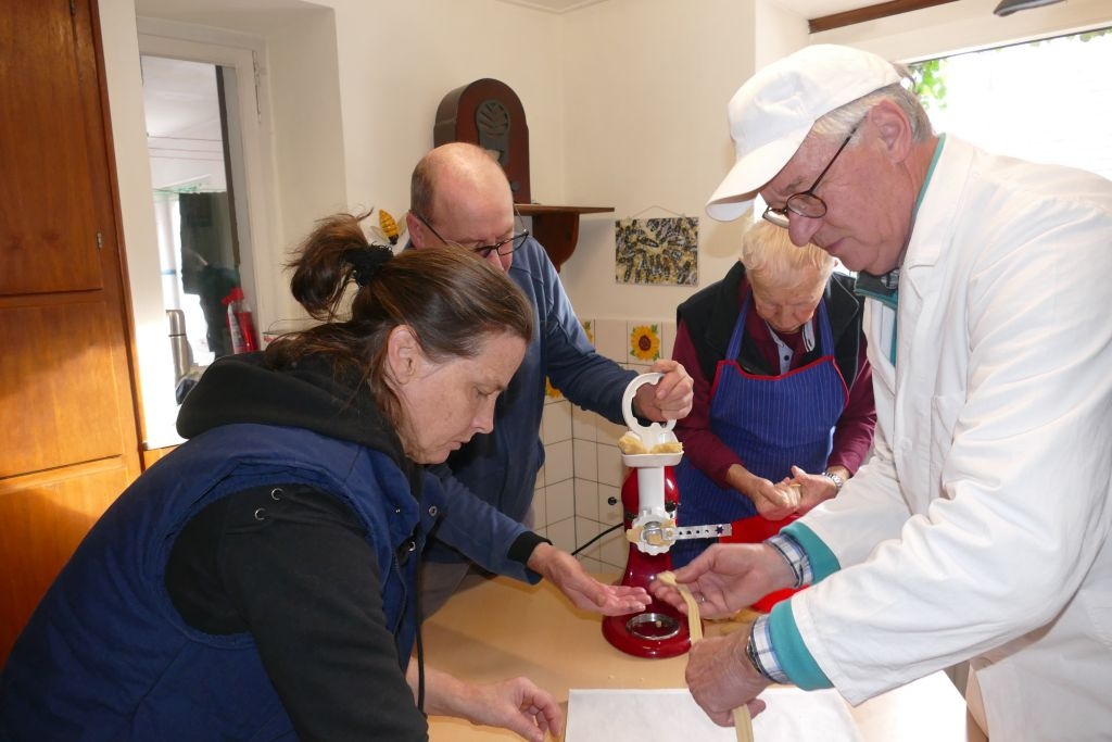 Am Samstag, dem 9. Dez. 2023, ging es in der „Bienenküche“ in „Schusdersch“ Haus recht geschäftig zu: Der aus zehn Kilogramm Mehl und all den weiteren guten Zutaten nach traditionellen Rezepten hergestellte Plätzchenteig wurde von mehreren Helfern „durch den Wolf gedreht“, die fertigen „Teiglinge“ fein säuberlich auf die bereitgestellten Backbleche gelegt und die Blecke dann zum „Backes“ gefahren. Hier „verschwanden“ sie nach und nach im bereits aufgeheizten Steinofen, um nach kurzer Backzeit als schmackhaftes Spritzgebäck - perfekt gebräunt - wieder das Tageslicht zu erblicken.